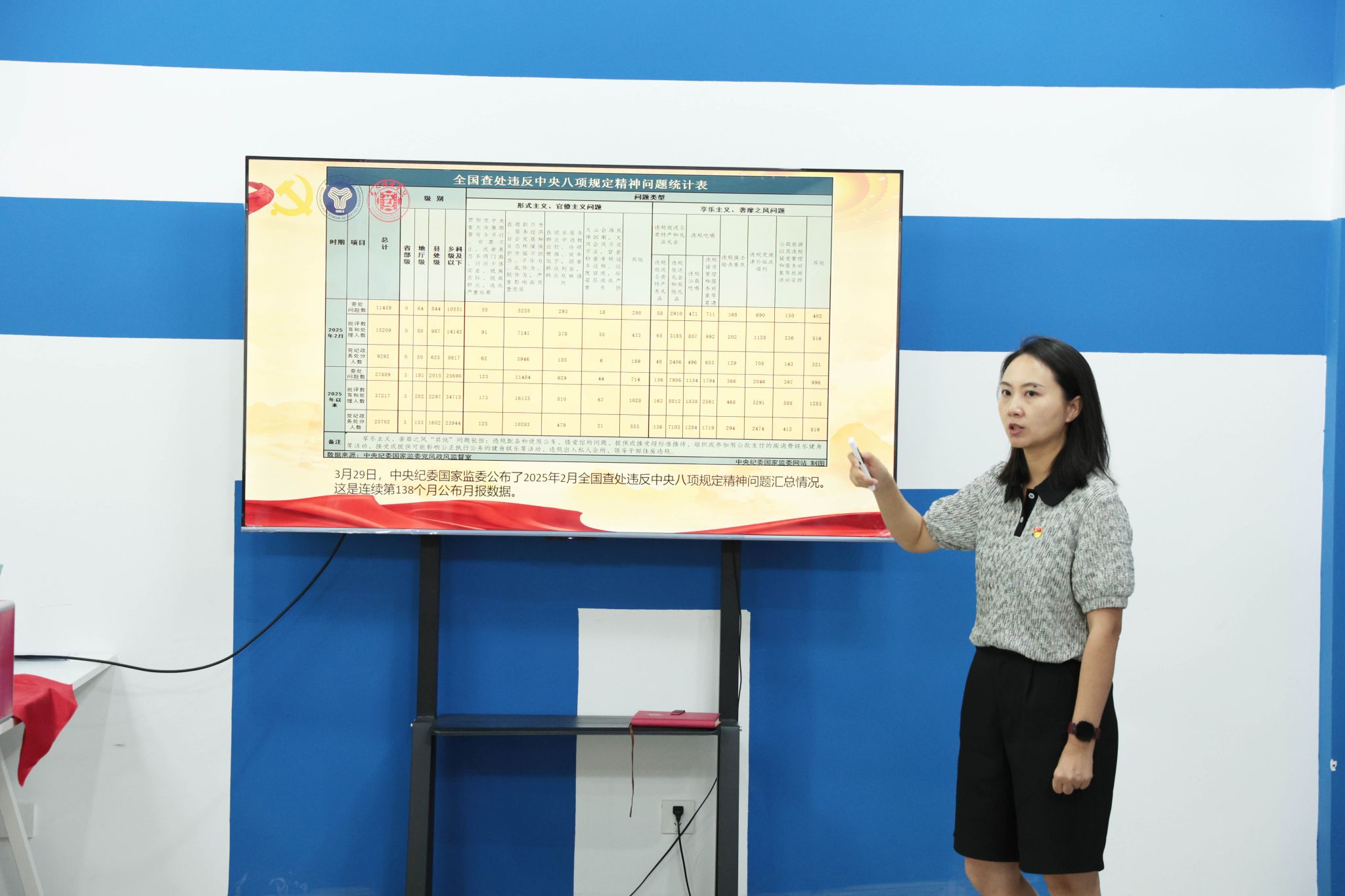 活动伊始,党支部书记郭菲同志对中央八项规定的具体内容进行了详细讲解,强调这是党中央为改进工作作风、密切联系群众所作出的重大决策部署。郭菲书记指出,八项规定是全面从严治党的切入口和动员令,是我们党员必须长期坚守、严格遵循的行为准则。通过深入浅出的讲解,党员们对八项规定有了更为全面、深刻的认识,为后续的学习奠定了坚实基础。