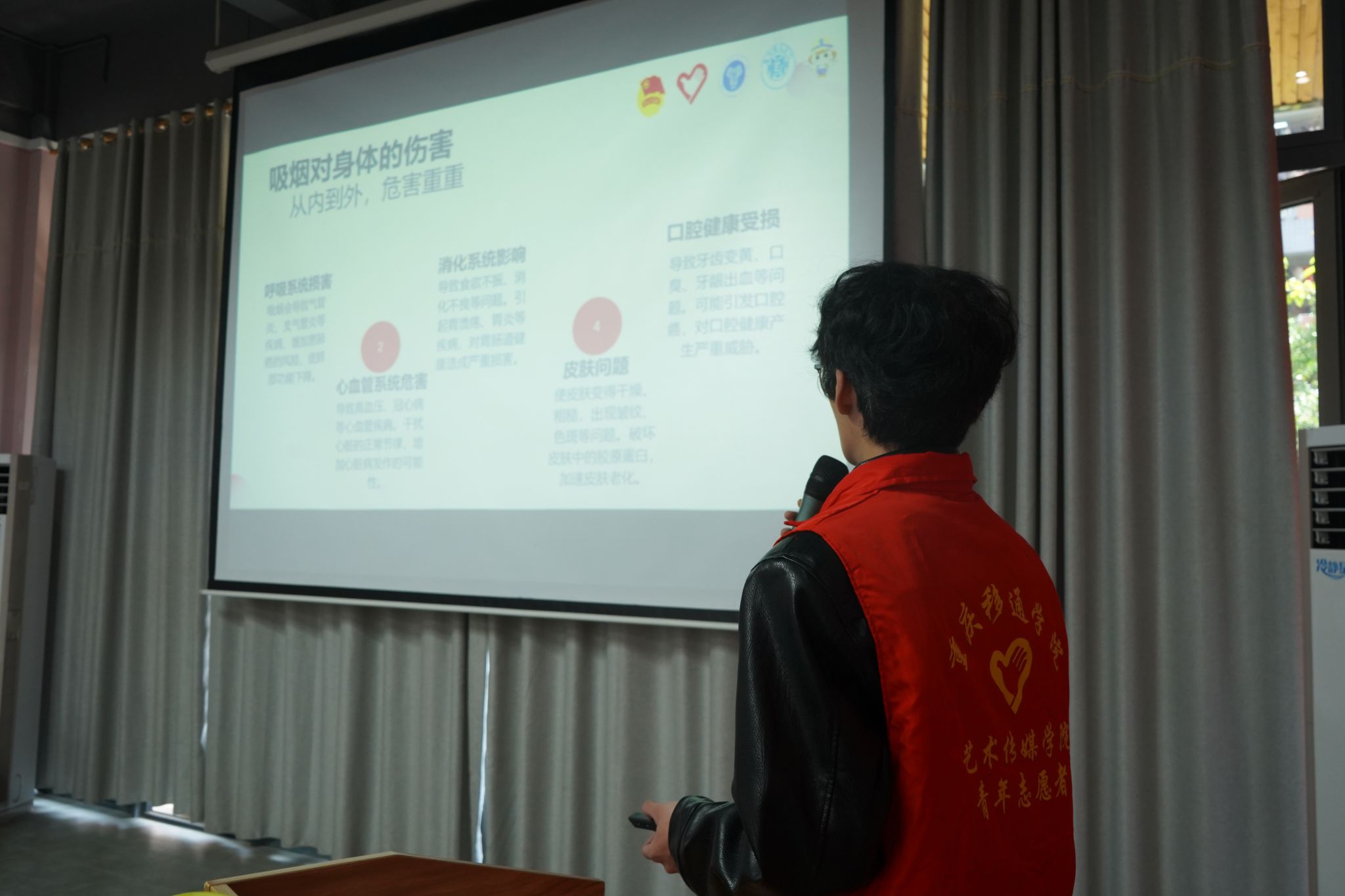 2025年4月9日,“青马工程”功能性团支部02支部联合青年志愿者协会开展了“解烟杂货铺”禁烟控烟活动。活动以“宣讲+视频”形式开场,通过观看案例让同学们认识到吸烟的危害。在问答环节中,志愿们积极参与,加深了对禁烟知识的理解,还设置了“以烟换糖”环节,在便利贴写下禁烟建议,倡导健康生活方式。此次活动为营造无烟校园迈出了坚实的一步,鼓励志愿者做禁烟的倡导者和践行者。