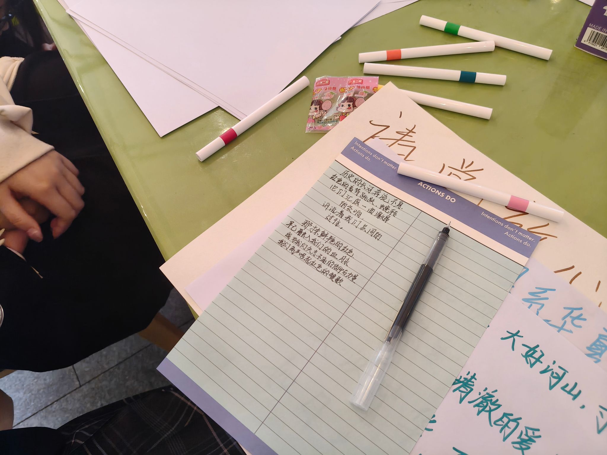 时间慢慢溜走,我们的活动进入了最后一个环节——写作环节,同学们可以选择诗歌、文案或故事写作的任意一类,并结合自己对党的认识或者自己的完满故事进行创作。大家很快投入到创作中,有的同学写出了充满激情的诗歌,有的写出了令人感动的完满故事,还有的同学将图画和文字结合起来,让作品更加生动。一些同学还主动上台朗诵自己的作品,同学们响亮的朗诵声更是赢得了全场热烈的掌声。