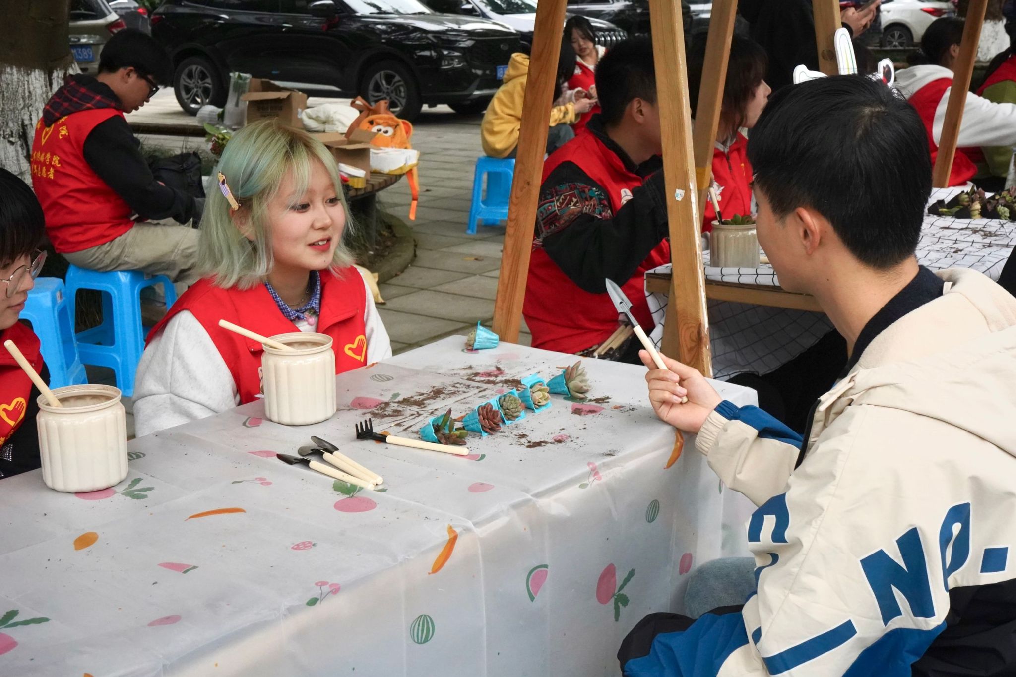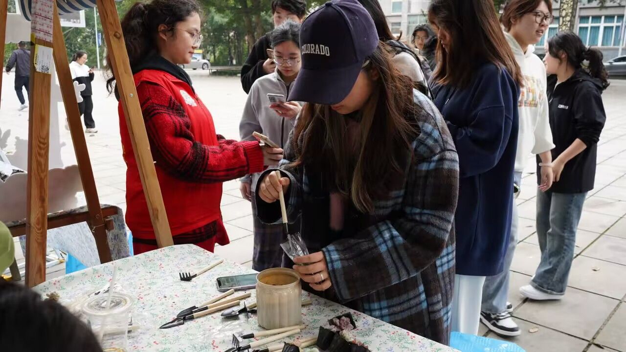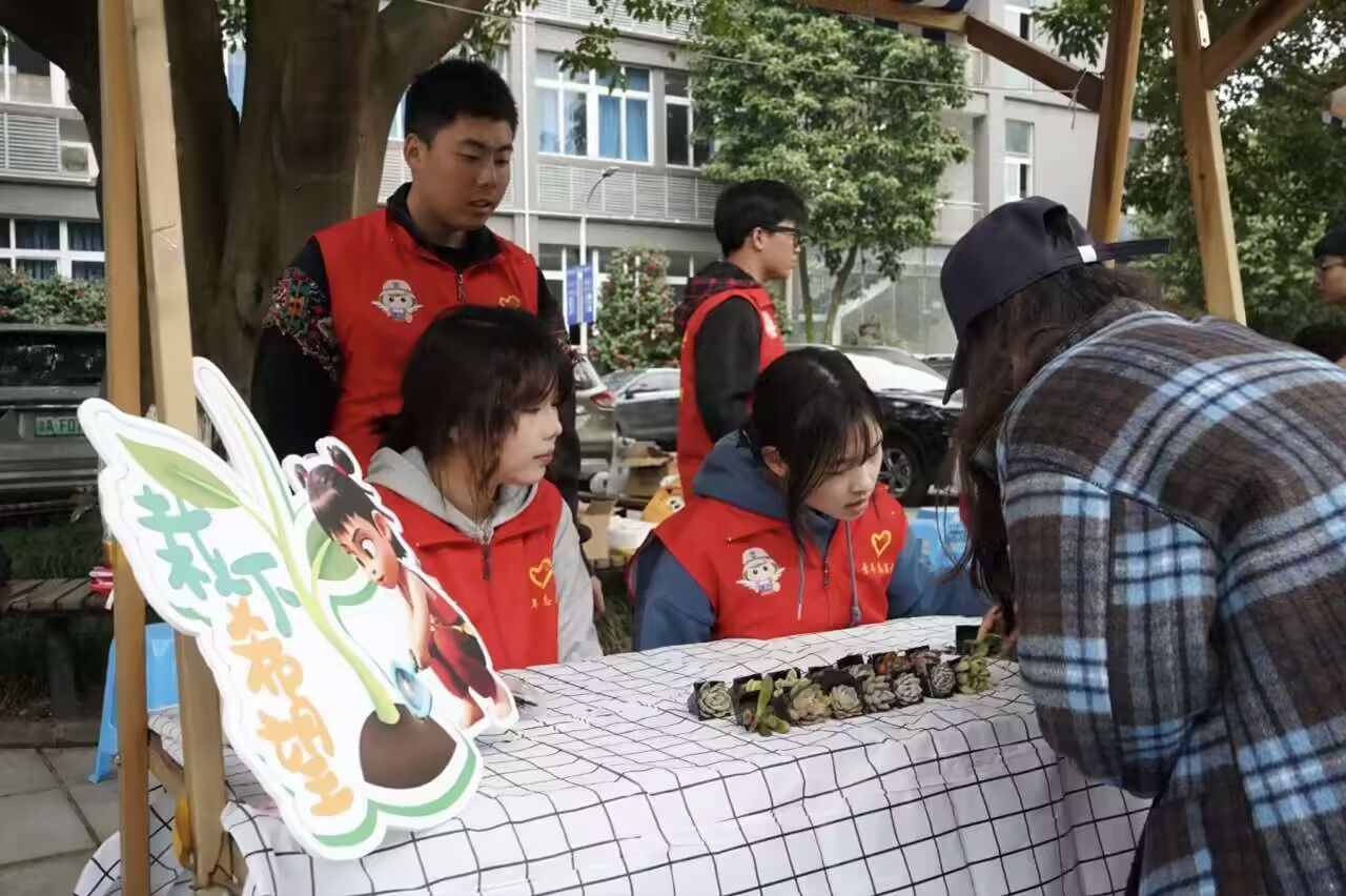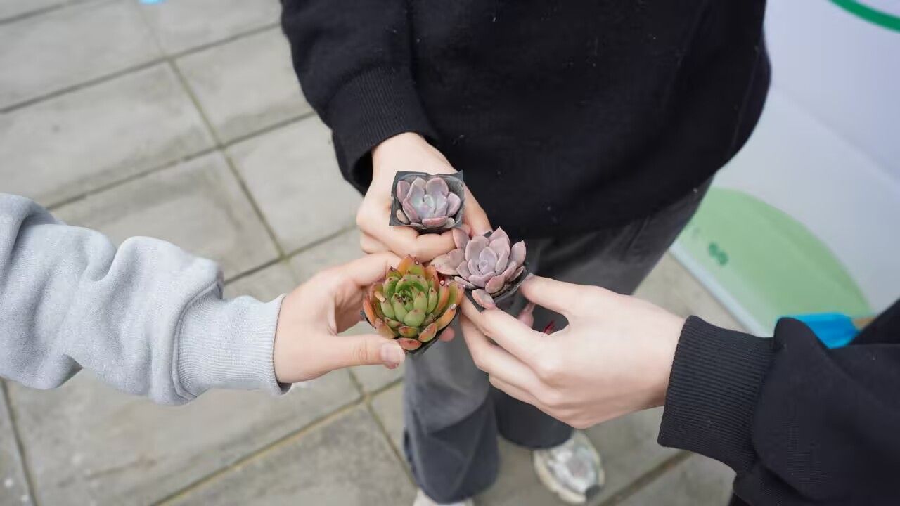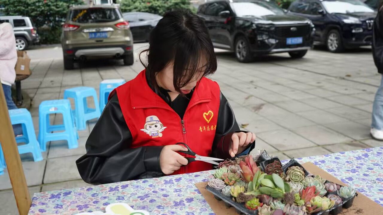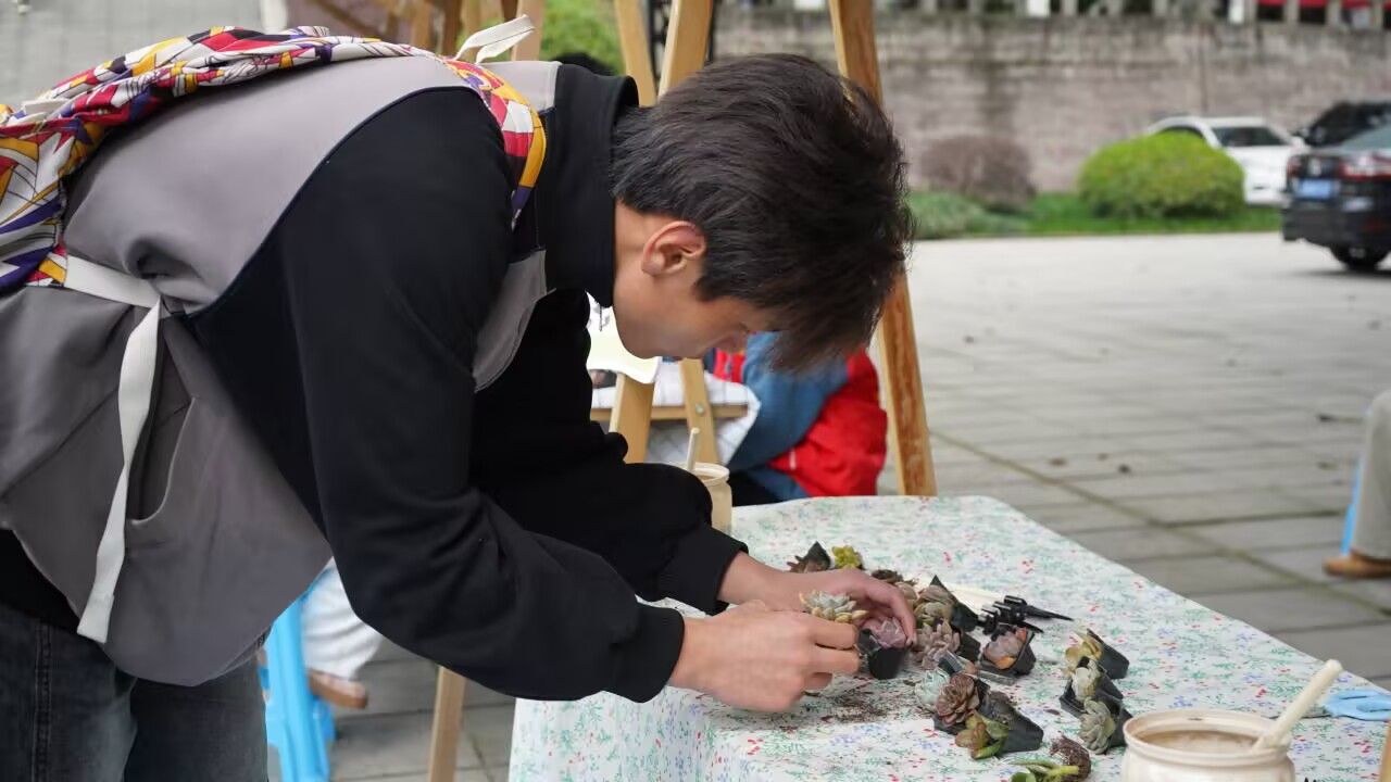 双协联动凝巧思,巧手生花暖初春。活动前期,双方通力合作,各司其职。花卉协会成员发挥专业优势,筛选多肉植物为易养护品种,并设计多种种植教程;青年志愿者协会则负责筹备工具、制作环保展板及活动物料。活动当天,志愿者们用绿植装点展台,悬挂“一花一叶皆自然”标语,营造出清新活力的活动氛围。花卉协会成员现场演示土培、组合盆栽等不同种植方法,详细讲解配土比例、光照需求及养护技巧。 参与者们在志愿者的指导下挑选心仪的多肉,亲手填土、栽种、装饰,制作专属绿植作品。现场洋溢着创造与协作的乐趣。