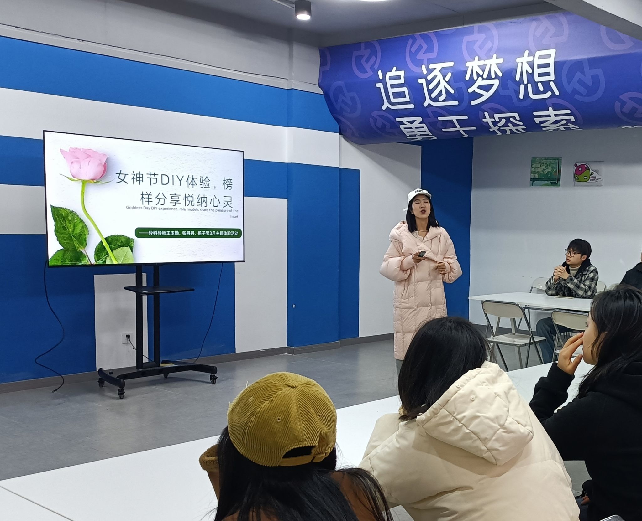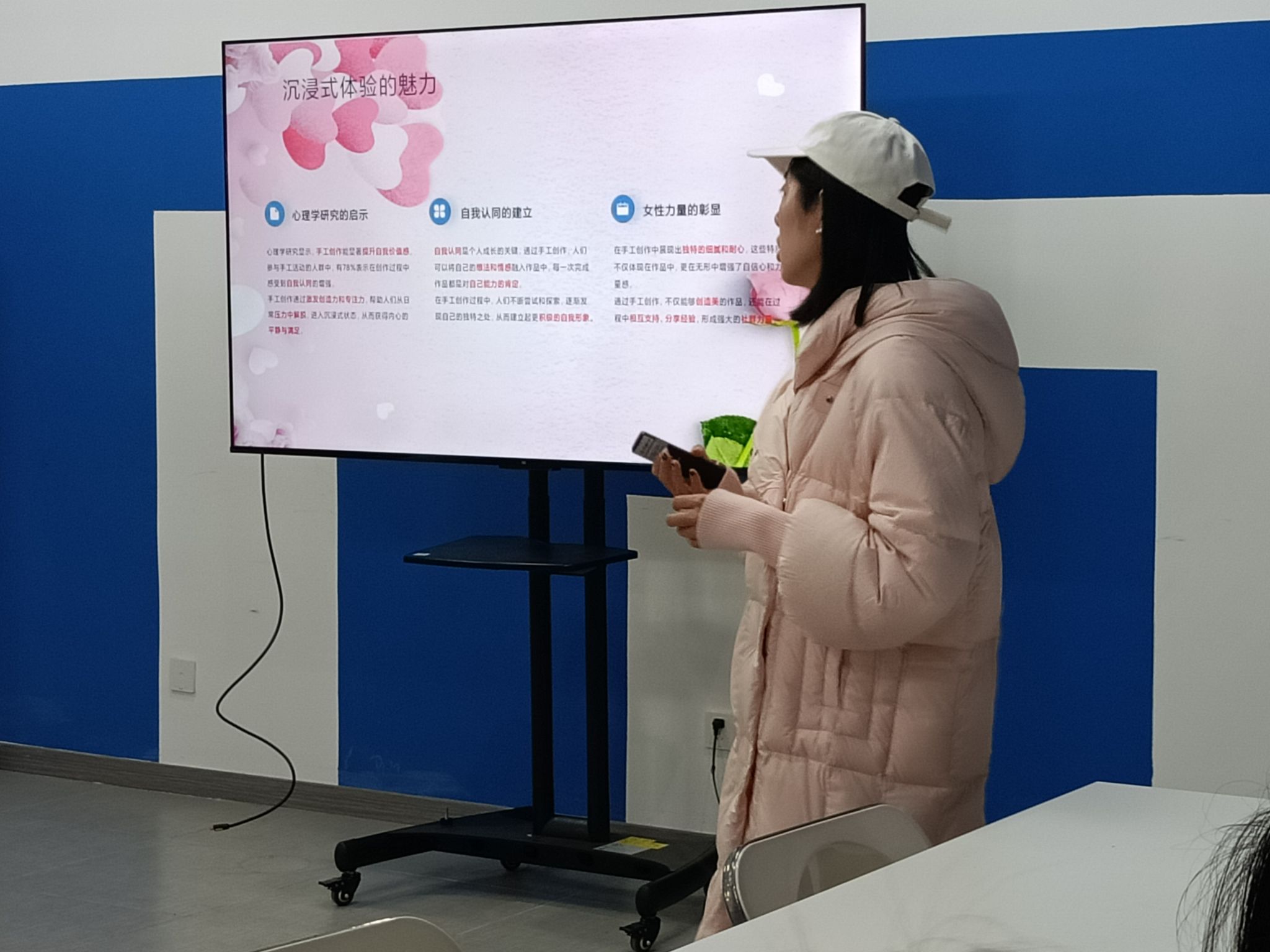 王玉勤老师为大家讲解本次沉浸式体验的魅力及关注的心理体验。以深入浅出的方式,从心理学研究启示,建立自我认同,彰显女性力量等角度,引导大家通过体验手工创作,激发创造力和专注力,提升自我价值,肯定个人能力,建立积极自我形象,在团体中互相支持、分享经验,创造美、感受美,释放压力,获得内心宁静与满足。引导她为在场的同学们带来了一场心灵洗礼。