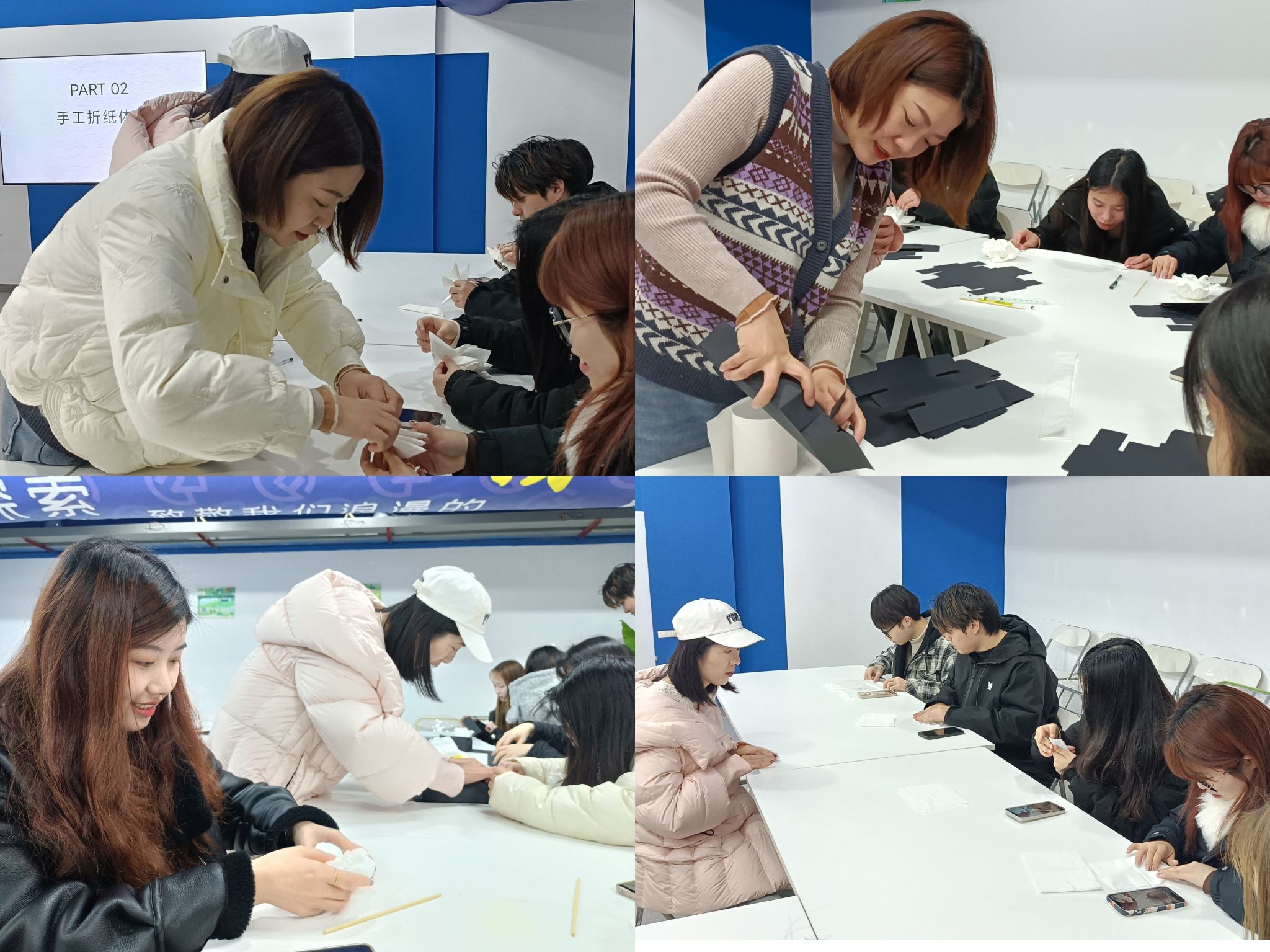 紧接着,活动进入充满创意和乐趣的DIY折纸环节。三位老师为大家分发折纸工具,在张丹丹老师专业的折纸技术指导下,大家跟随着三位老师的步伐开启自己独一无二的作品创作时光,在教学基础上加入自己的创意思维,用一张张纸巾折出寓意悦纳、乐观、力量、美好的心灵作品。