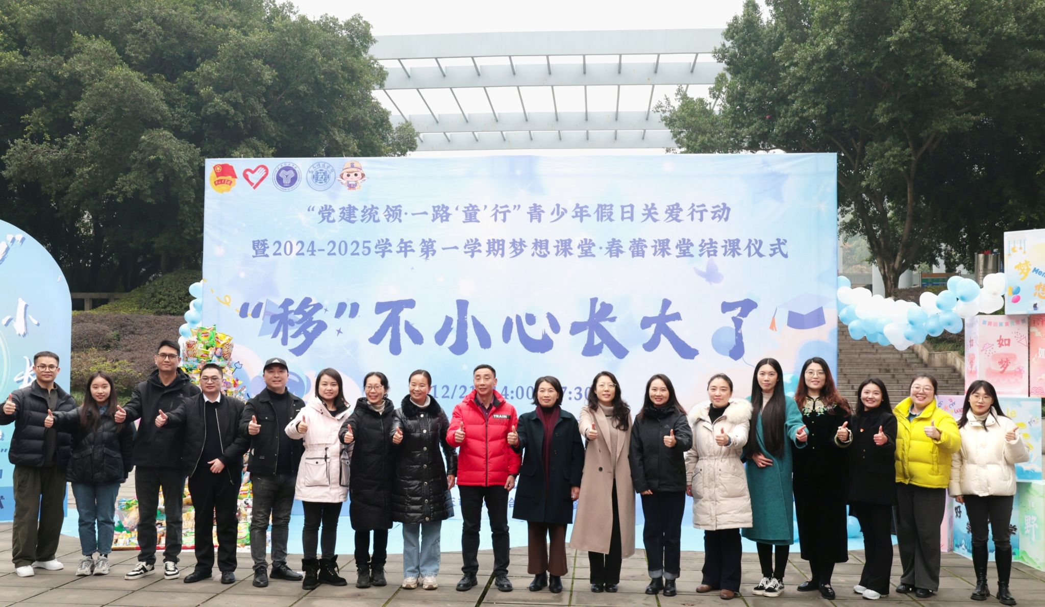 重庆移通学院艺术传媒学院青年志愿者协会在校内黄桷树广场成功举办了“党建引领·一路‘童’行”青少年假日关爱行动暨2024-2025学年第一学期梦想课堂·春蕾课堂志愿服务专项支队结课仪式
