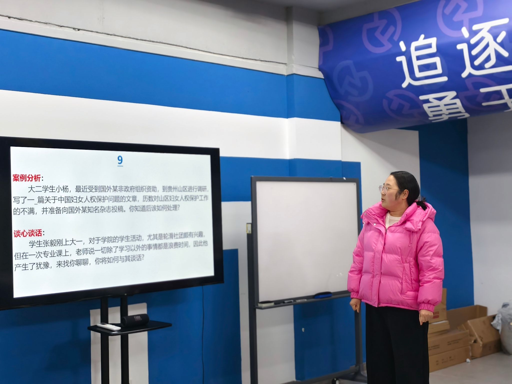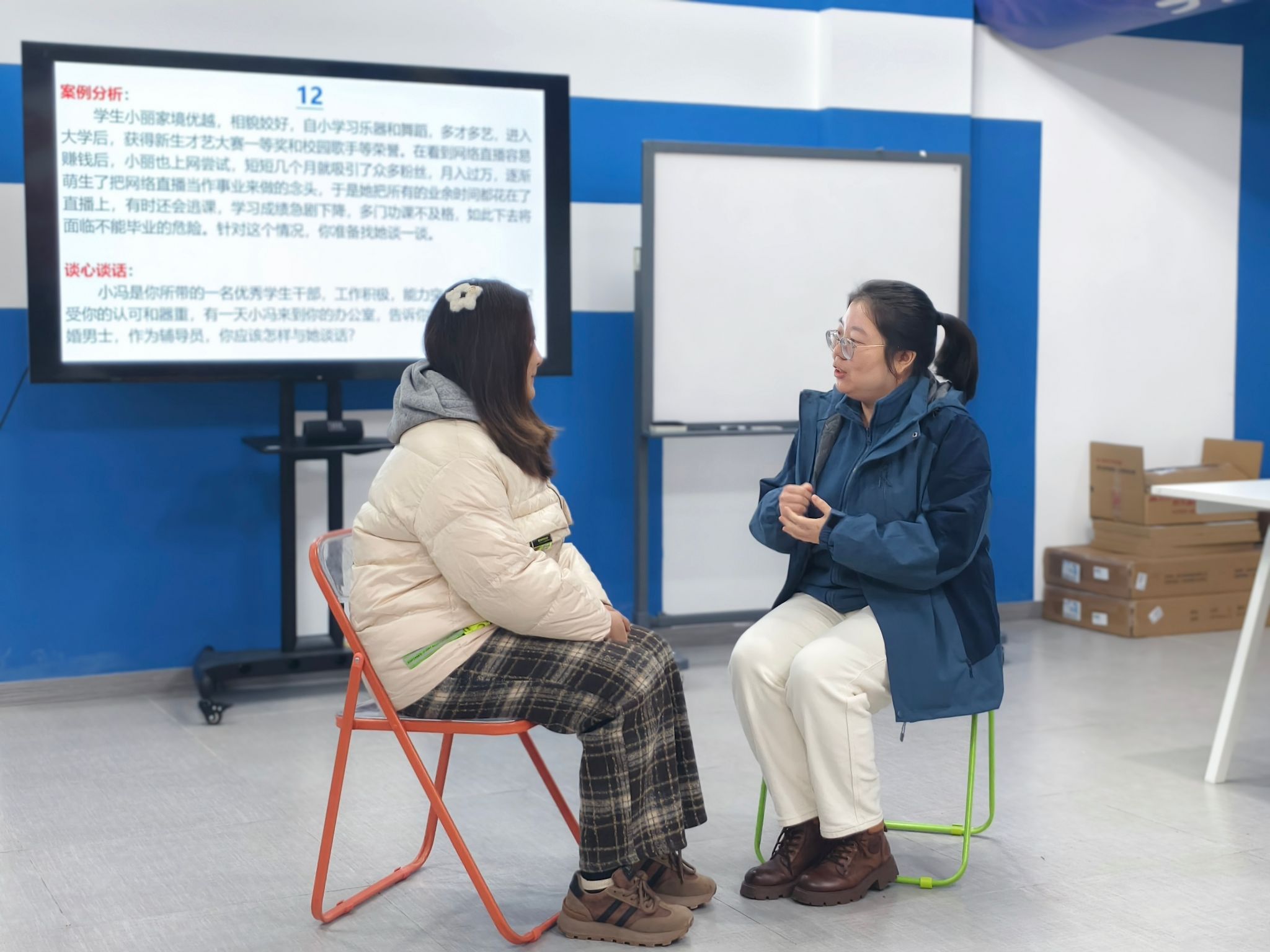 谈心谈话,辅导员们从思想价值引领、网络思政教育、职业规划、人际关系处理等方面入手,采用心理学访谈技巧掌握谈话节奏,引用规章制度法律条文约束处事行为。
