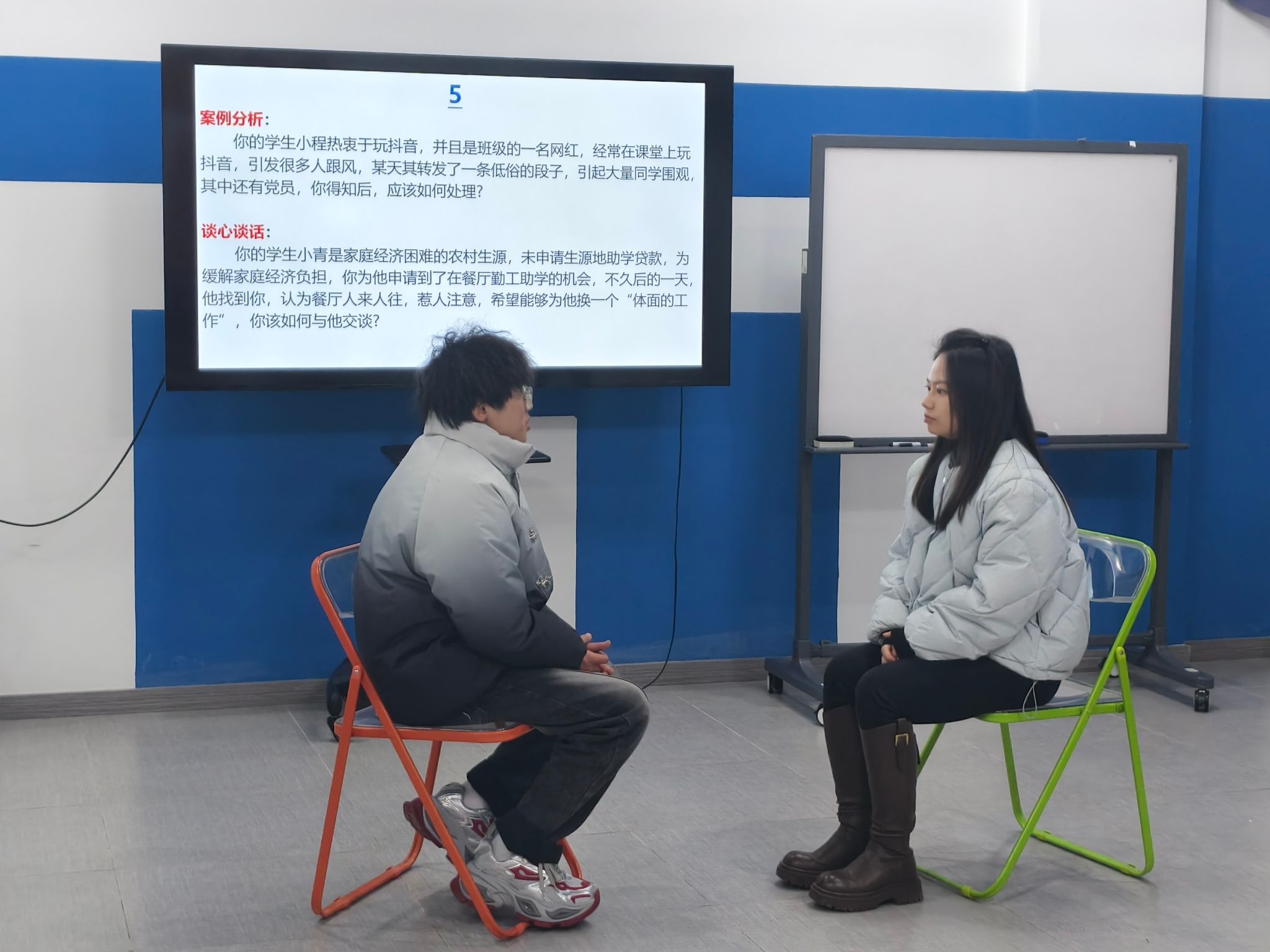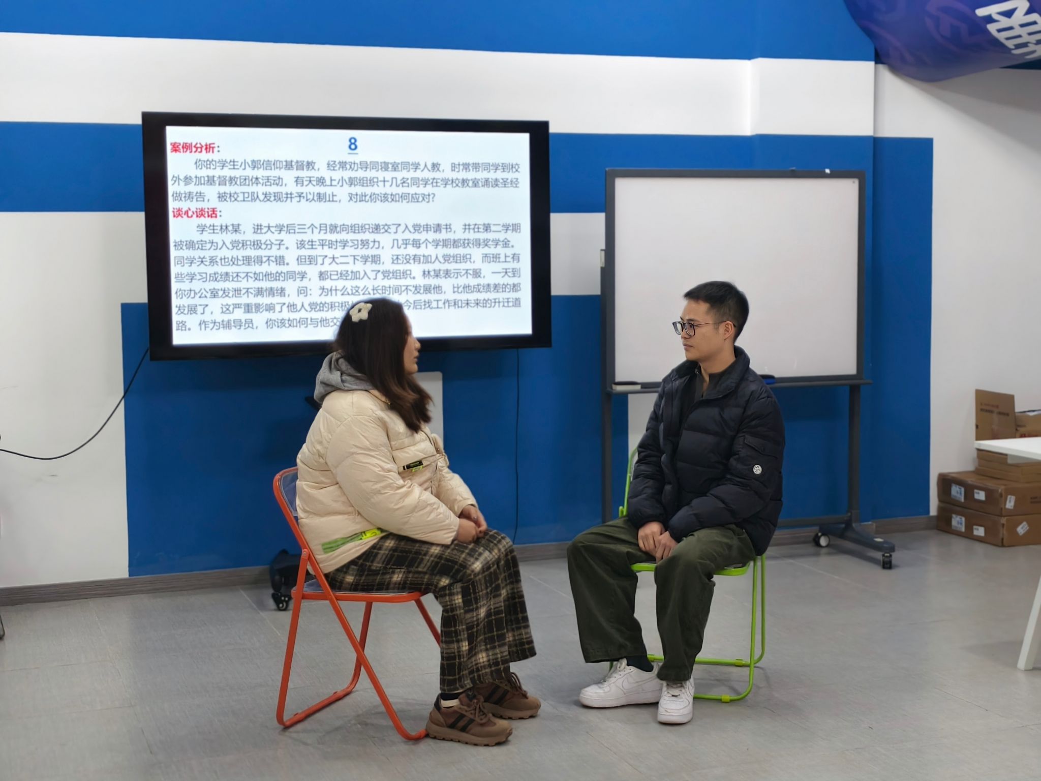 大赛分笔试和综合能力测试两个部分,笔试表达理论知识,综合能力测试彰显实践水平。学院于12月13日开展笔试,12月16日开展综合能力测试,测试由案例分析和谈心谈话两个板块组成,题型围绕辅导员九大工作职责,以及部分实际案例展开。