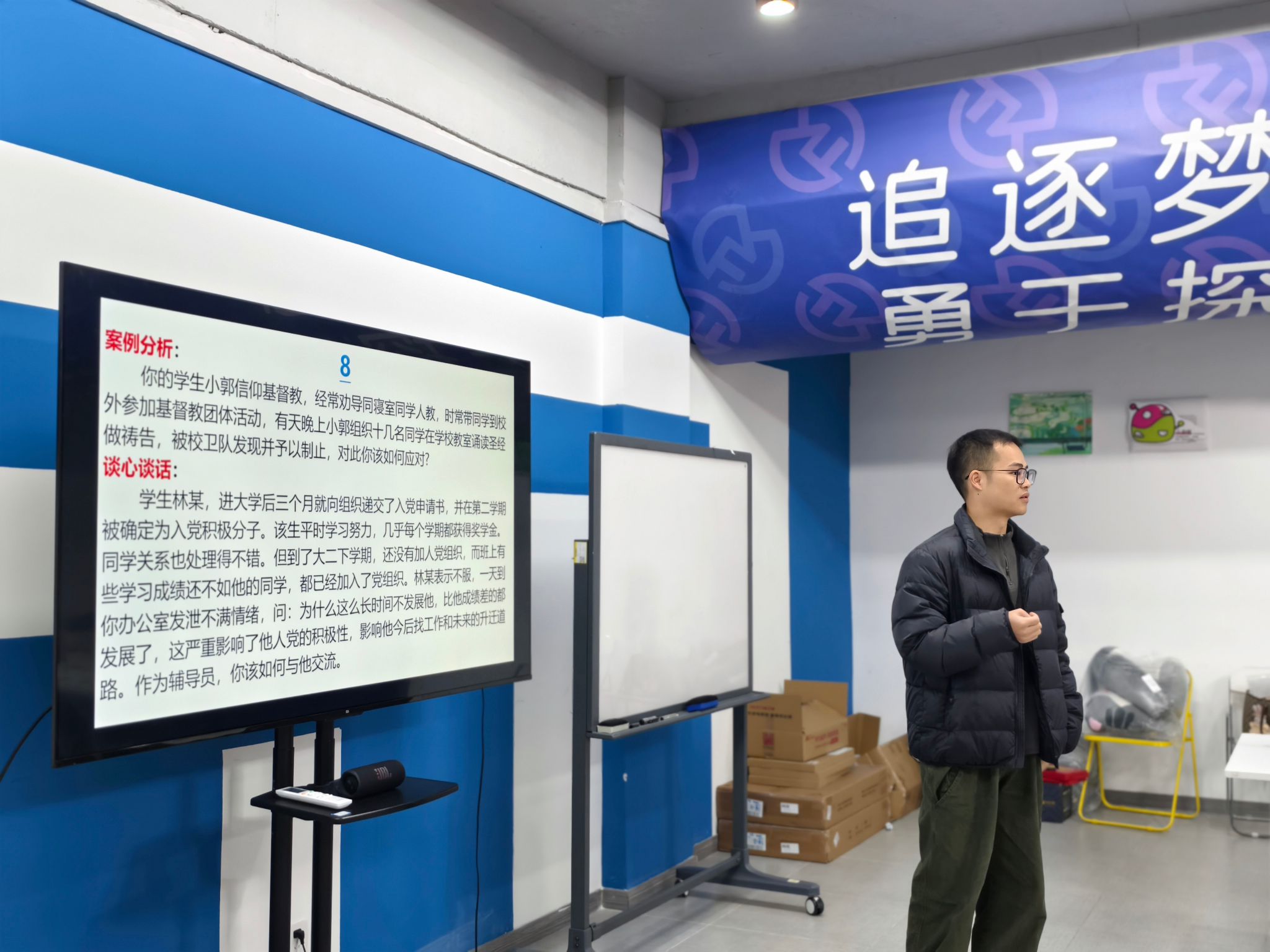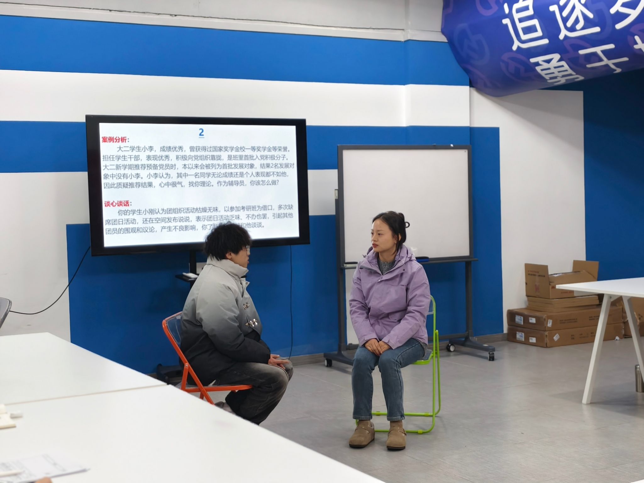 强化理论学习,提升专业素养,为强化辅导员职业认同,提升辅导员业务水平,培养辅导员队伍职业化、专业化、专家化发展。2024 年 12 月16日,艺术传媒学院于天空书院朋辈交流室顺利开展了第一届辅导技能大赛,学院全体在校12名辅导员参与,比赛由艺术传媒学院学工副院长郭菲老师、通信与信息工程学院学工办主任苟帆诚老师、淬炼商学院团总支书记黄新燕老师、远景学院学工办主任王诗颖老师担任评委。