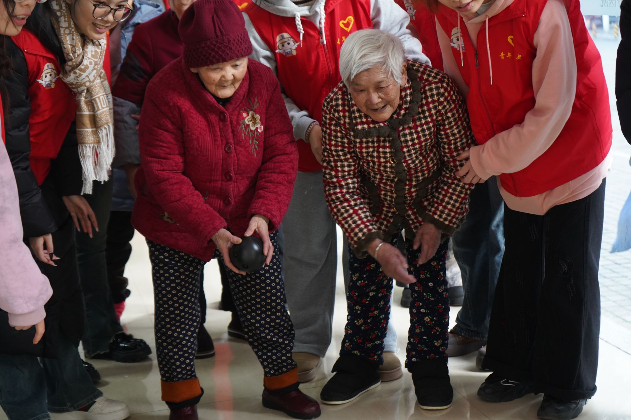 老人们满怀热忱地参与保龄球游戏,用力掷出球,击倒寓意厄运的瓶子,祈愿新年好运相随,现场气氛热烈,众人沉浸其中。写春联与疯狂打地鼠游戏也大受欢迎,老人们的欢声笑语交织一片,满是新春的喜悦与活力。 现场欢笑声此起彼伏,交织成一曲欢乐祥和的新年乐章,让每一位老人都沉浸在温馨、愉悦的节日氛围之中,尽情享受这欢乐满溢的时刻。