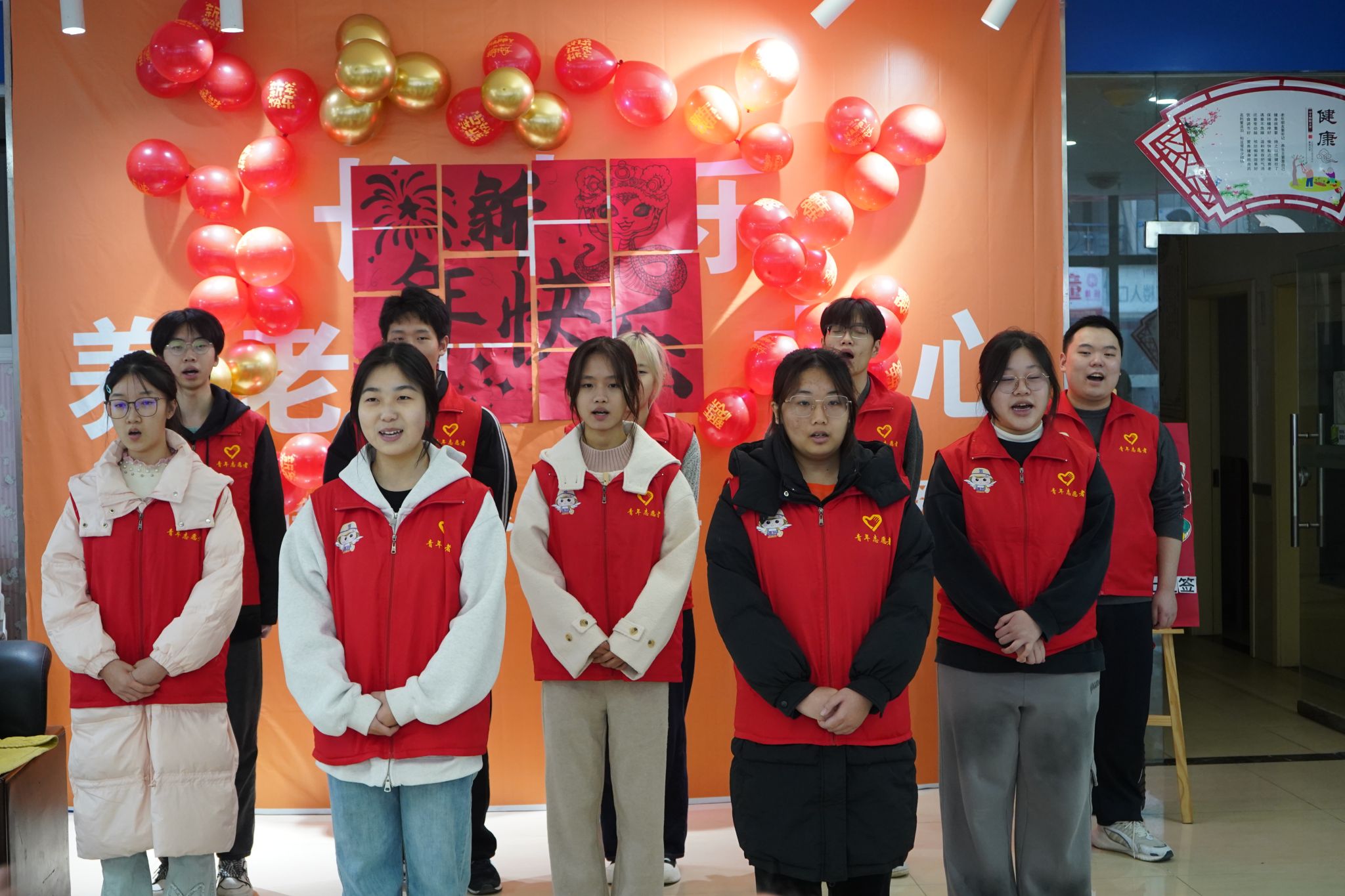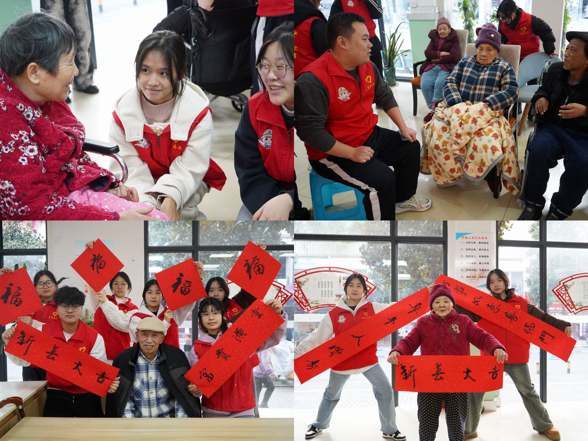 岁末年初,寒意正浓,团支部的成员们满怀着热忱与爱心,踏入了养老院的大门,开展新年布置活动,期望为老人们勾勒出一幅温馨喜乐的新春图景,让温暖与关怀在这方天地中满溢。在活动现场,团支部成员们贴心地将房间里以及楼上行动不便的老人扶到观众区落座,让他们能够尽情享受节目。