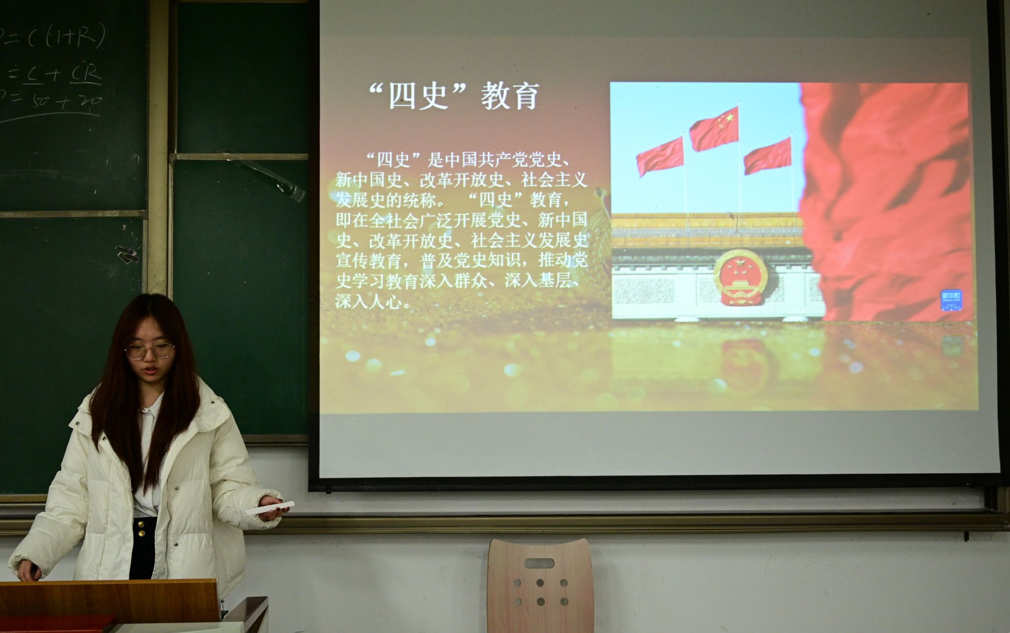 理解党团历史,汲取时代精华。首先,她为在坐的同学们讲解了“四史教育”,也就是中国共产党史,新中国史,改革开放史,社会主义发展史。希望大家可以从“四史教育”汲取治国理政的智慧,体会中国特色社会主义的先进性与时代性,增强理想信念,也可以在团课上开展这些党团历史发展的内容的学习,将我国发展道路上的有益思维运用到以后的日常学习生活中,也可以在此基础上进行一些创新发展,使团课开展更具有班级特色以及班级针对性。