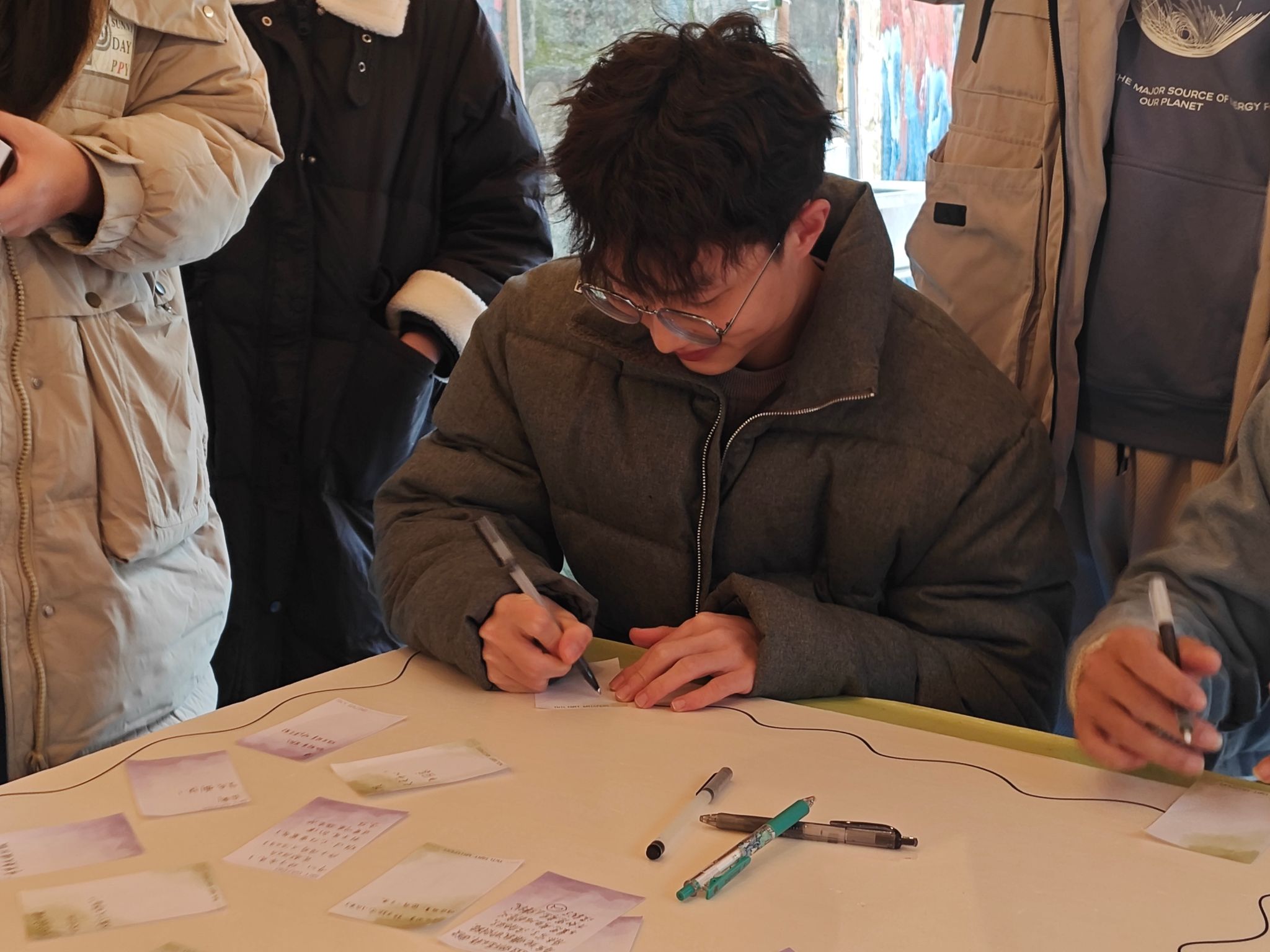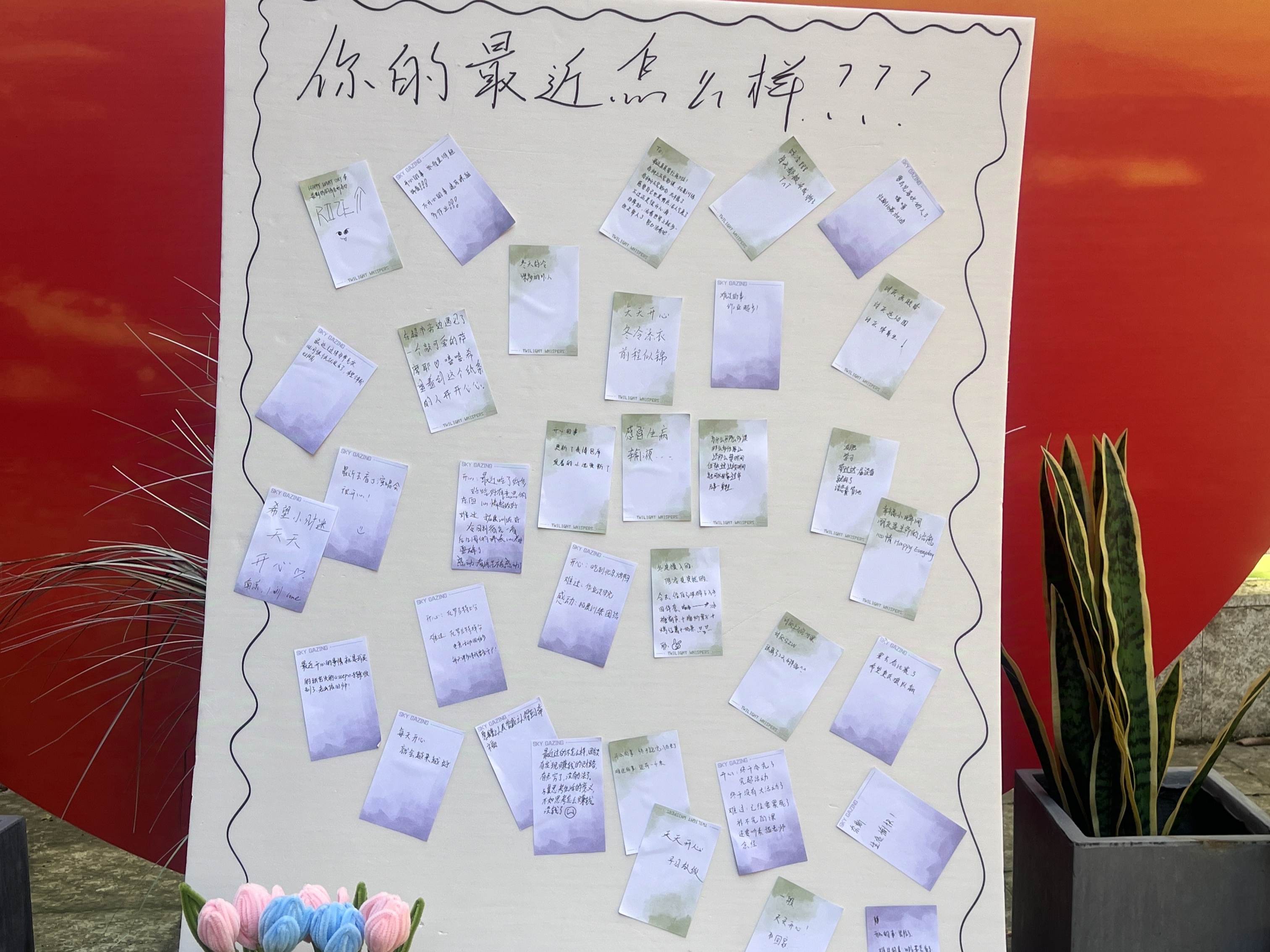 在同学们的签到完成后,伴随着温馨的灯光和舒缓的音乐,活动也正式开始。主持人介绍完活动后,同学们开始了第一个项目“花语传情”。工作人员为同学们分发纸笔,让她们在纸条上书写着自己近期的情绪,有开心的亦或是忧愁的,所有情绪释放于纸条,同时在贴上kt板的过程中同学们也会与旁边的同学互相交流着最近发生的事情,通过纸条吐露情绪,又在交流中增强理解,互相鼓励,此环节让大家学会积极地面对生活中的情绪,学会诉说压力,用倾诉的方式互相理解互相鼓励,接收好心情,释放坏情绪。