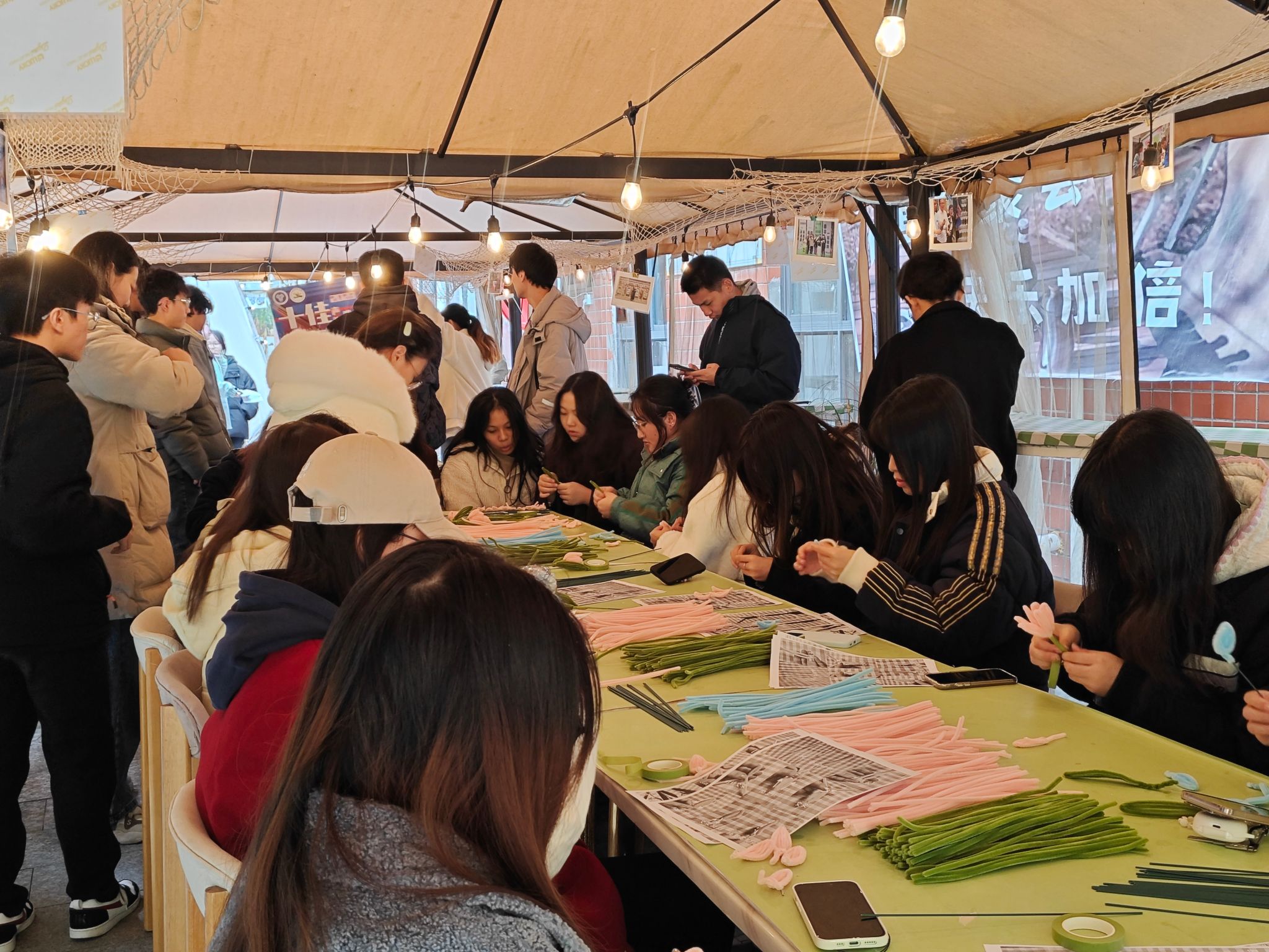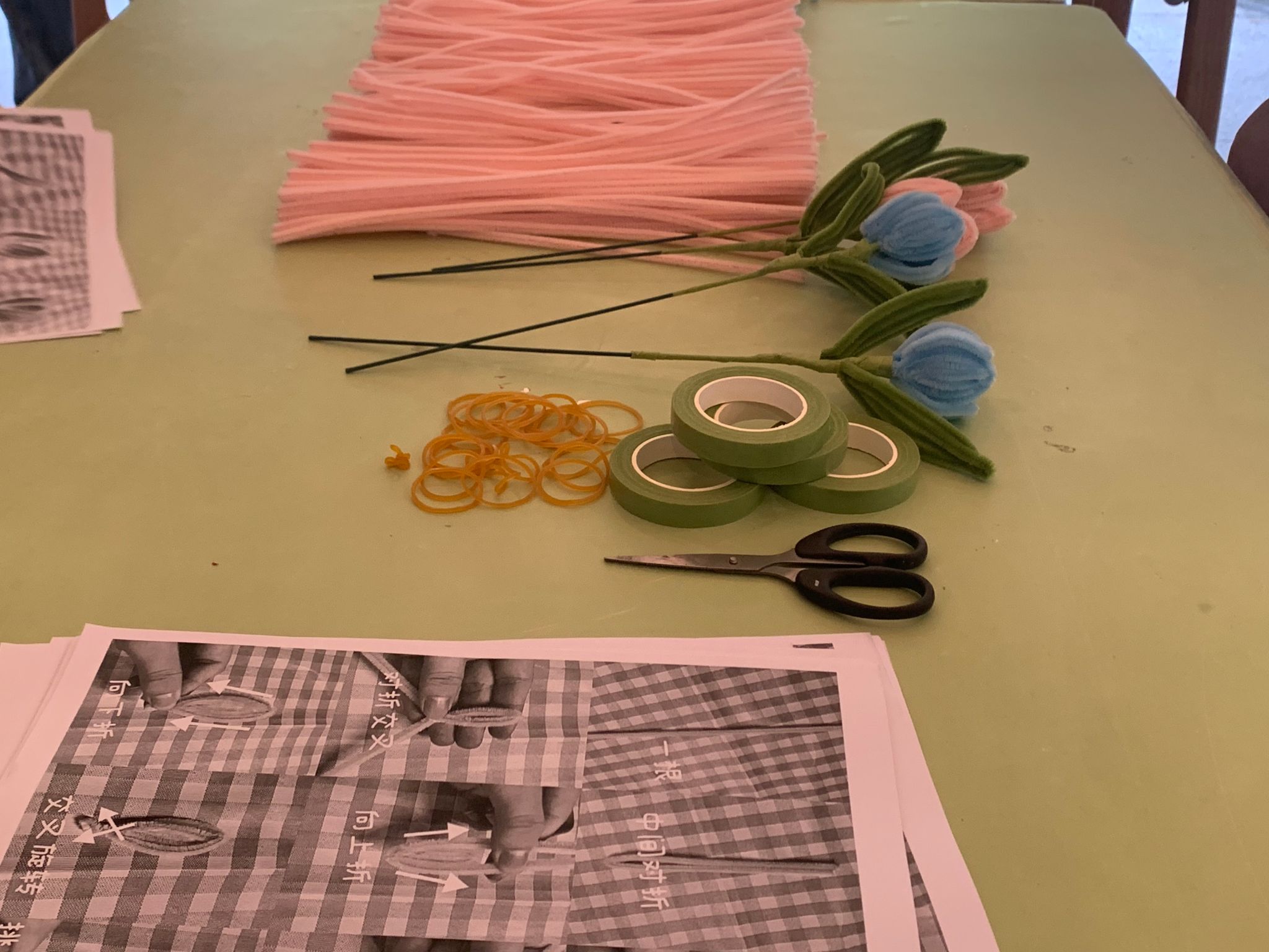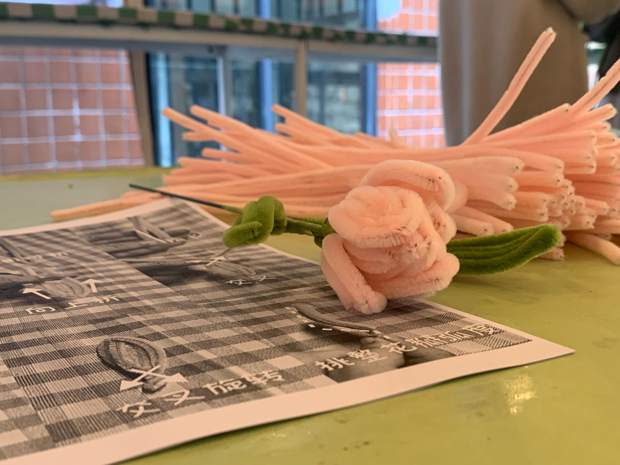 “花语传情”后,大家移步到制作“友爱之花”的长桌旁,桌上是琳琅满目的各类材料。负责人将纸质版的教程分发给各位参与者们讲解起如何将一根根扭扭棒制作为可爱灵动的花朵,同学们拿起材料跃跃欲试,围坐一团探讨着制作步骤,而后大家的话题开始展开,边做边诉说着最近发生的境况与感受,有的人变成了倾听者,有的则变成了讲述者。同时网新一班的团支书化身引航者开始现场教学,悉心指导参与者进行色彩的搭配和造型的设计。