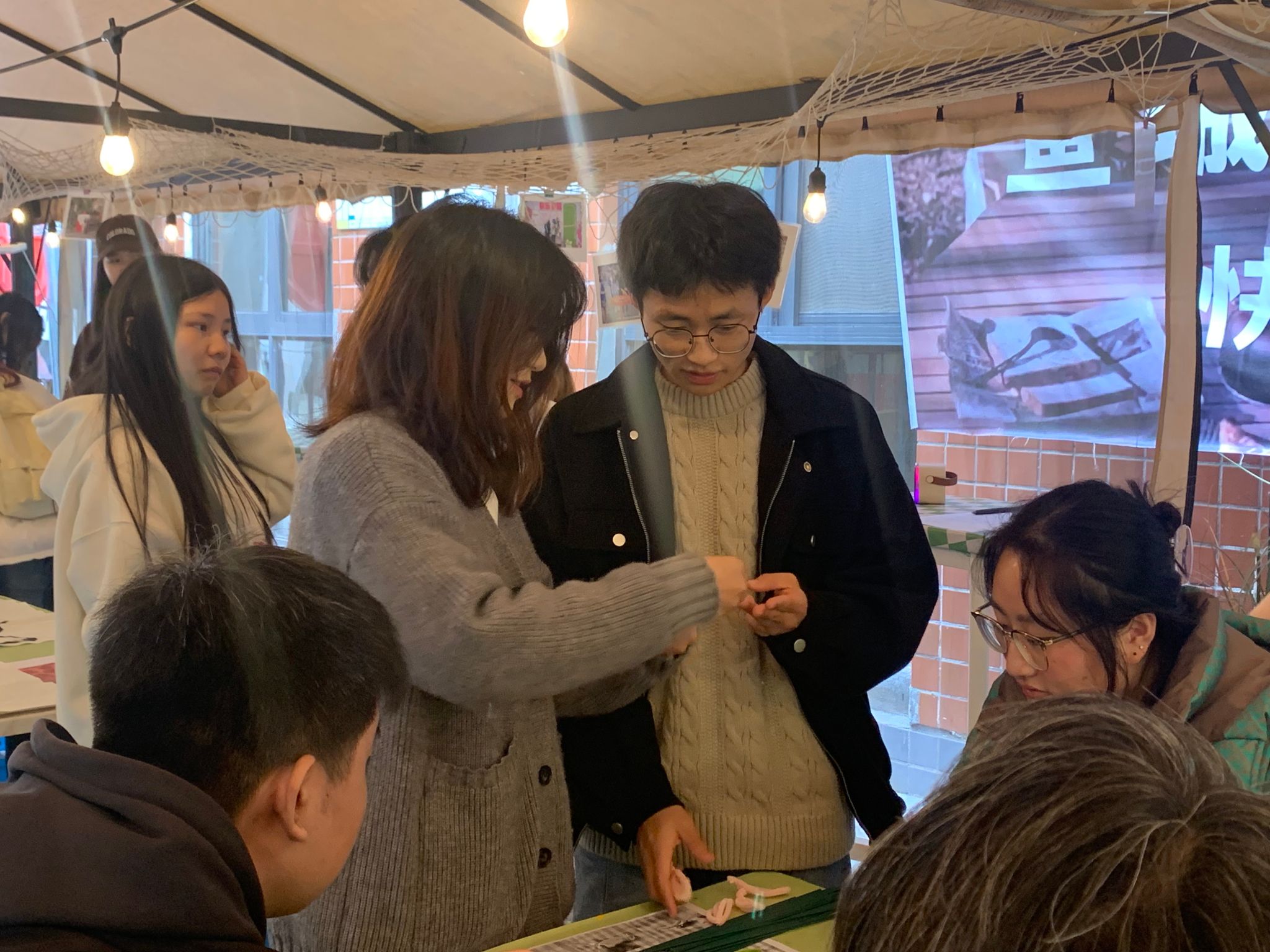 大家用温暖的笑语打破初冬的寒冷,众人皆沉浸其中,每一朵花都承载着对他人浓浓的友爱,静候赠予珍视之人,制作过程互帮互助,有帮忙制作小零件的、有帮忙缠绕花瓣的、有帮忙递工具的,不仅对制作花朵熟练了起来更将大家熟络了起来。在活动尾声,猫学长也来给大家送温暖,大家都围在一起,装点着它。最后,大家纷纷将自己精心制作的花束赠与他人,递交方式多种多样,现场热闹非凡。