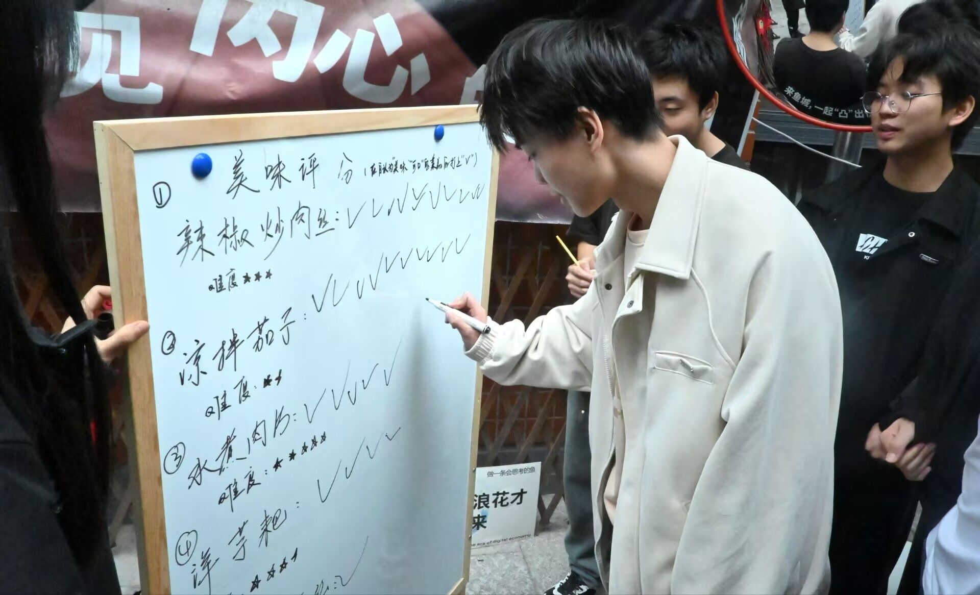 佳肴列阵待君评,一票权衡美味情。紧张的厨艺比拼过后,投票环节无疑是众人期待的焦点。此时,赛场仿若一幅色彩斑斓的美食画卷在众人眼前徐徐展开,水煮肉片红亮的油光闪烁着热辣的激情,辣椒炒肉青红相间散发着诱人的烟火气息,凉拌茄子紫润油亮似在无声诉说着清凉爽口的魅力,洋芋泥饼则透着质朴的金黄,仿佛将大地的馈赠完美呈现。参赛者们满怀热忱,将手中珍贵的选票投出,那不仅仅是一道道美味佳肴的评判,更是对厨师们精湛技艺与创意巧思的尊重与认可。这些环节不仅让同学们尽情的在赛场上释放艺术才华、领悟饮食文化的精髓,更创作了出属于他们独一无二的味道。
