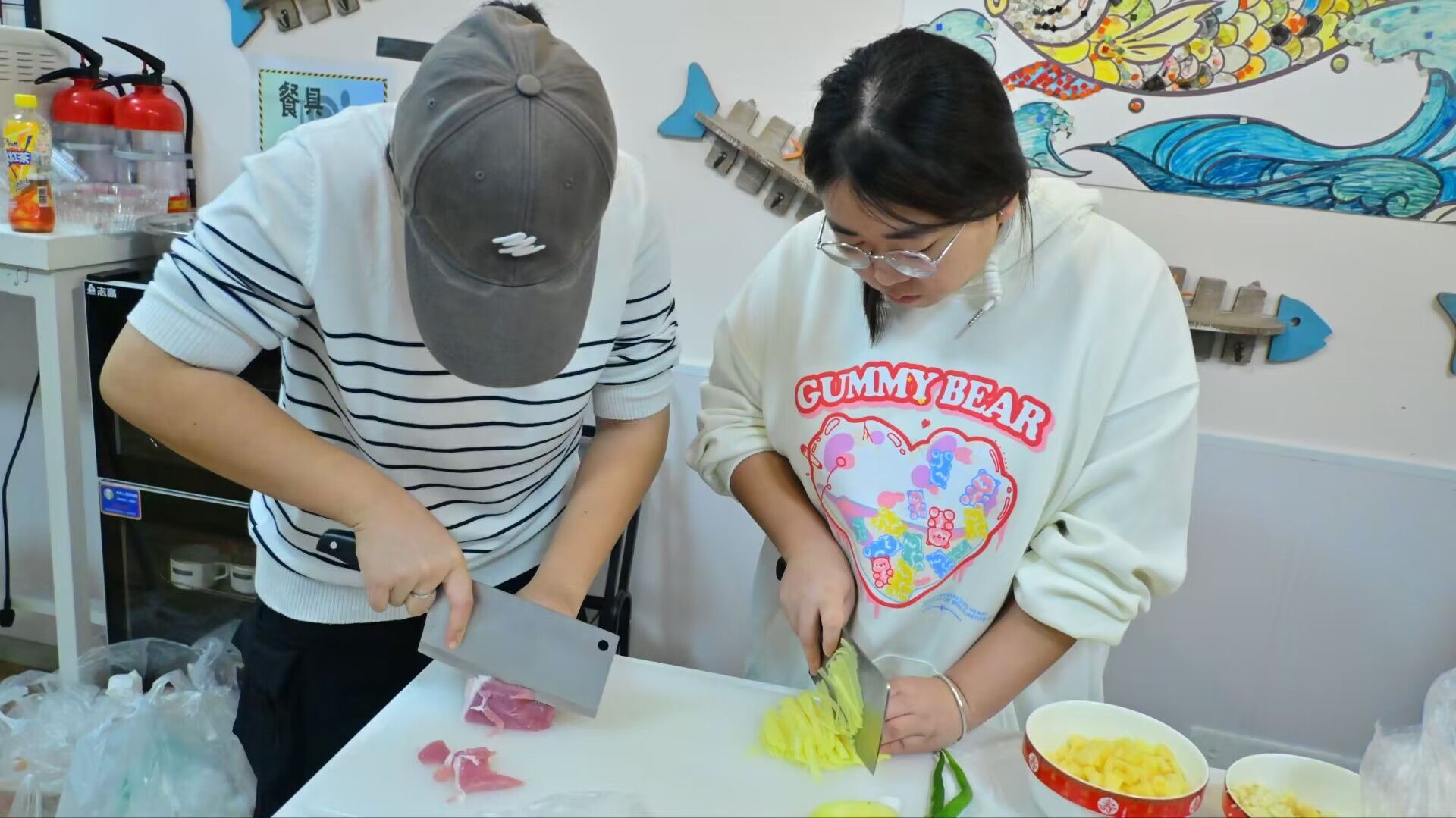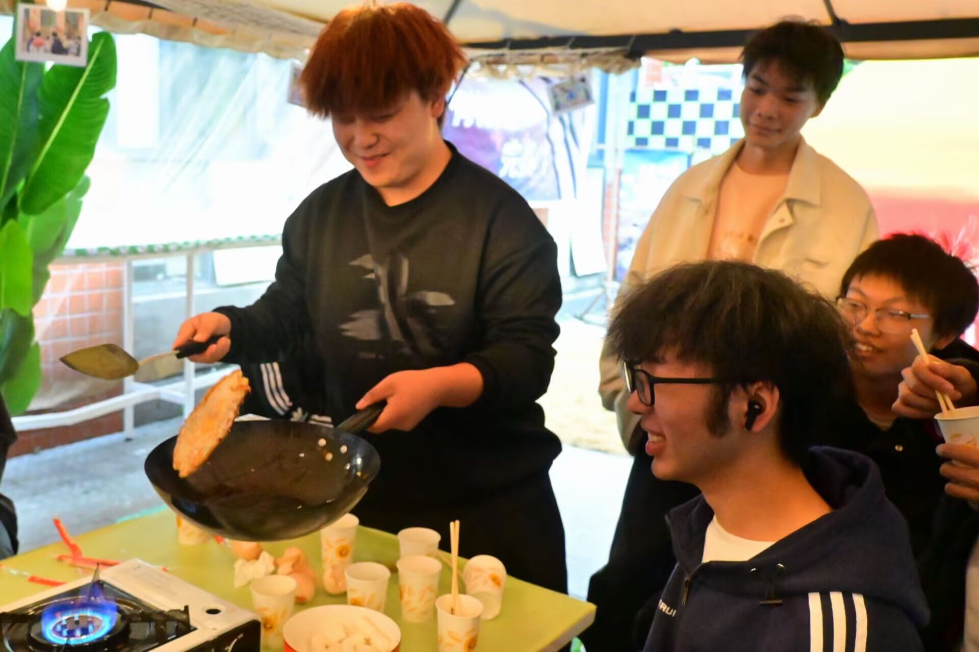 鼎鼐争雄烽火燃,刀光火影战厨坛。接下来的厨艺大比拼,现场热火朝天,两组同学各显神通,团队合作默契,让食材在锅中激情“碰撞”,演绎美味魔法,阵阵香气扑鼻而来,撩拨着众人的味蕾。周围的观众也在旁边自制美食,大胆的创新食材组合,各种独特的风味在这里交融,仿佛是一场舌尖上的奇幻冒险,精美的摆盘设计更是让菜品如艺术品般惊艳,赋予美食以视觉的盛宴。