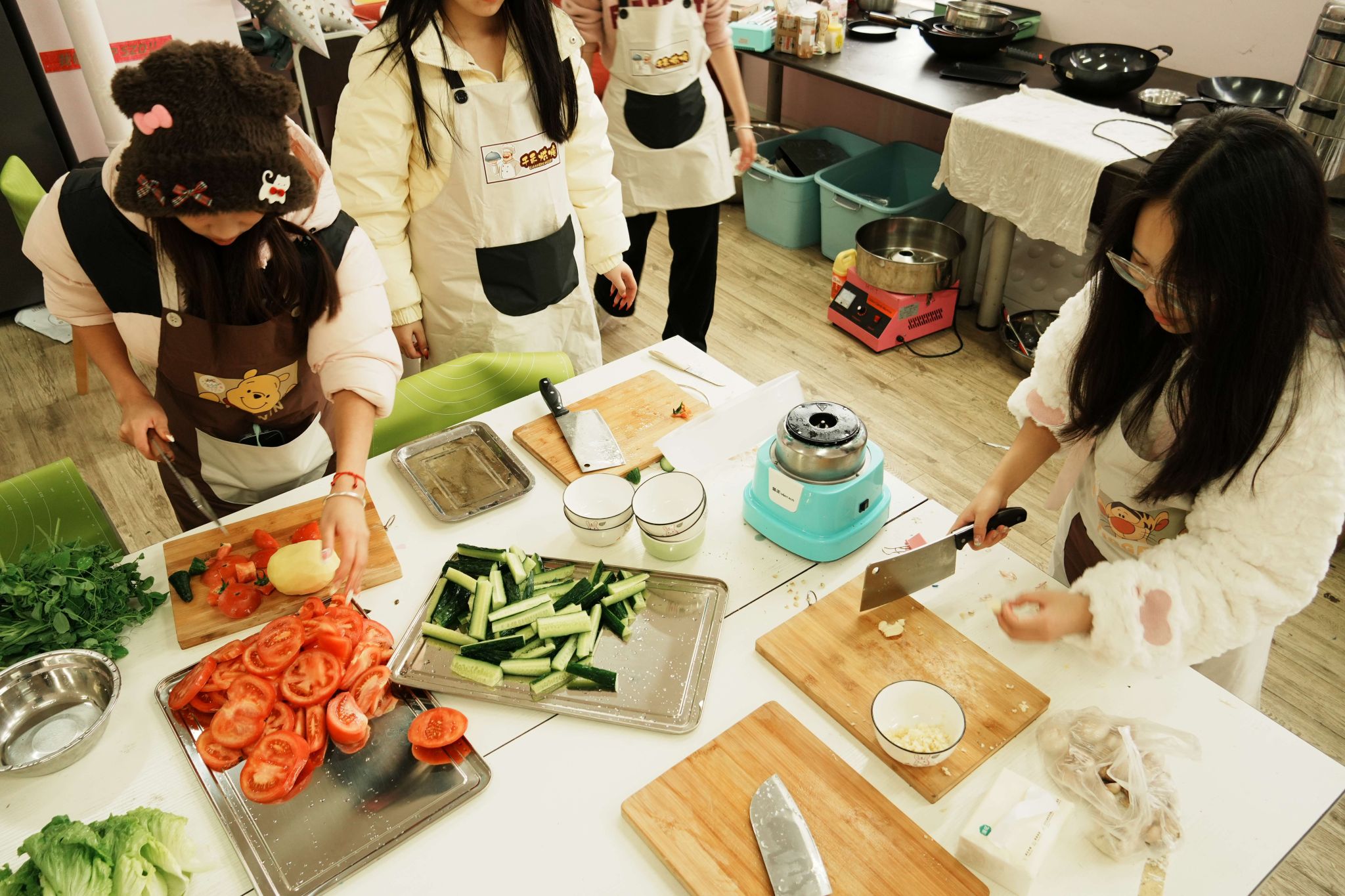 切菜是一场默契的团队协奏。每一刀切下,都伴随着清脆的声响,奏响了烹饪的华丽乐章,切碎了平淡,切出了生活的精致与温馨。同学们的眼神专注而明亮,脸上洋溢着纯真的笑容。有的微微蹙起眉头,全神贯注地掌控着刀的走向;有的则与身旁的伙伴轻声交流,分享着切菜的小窍门,欢声笑语在厨房中回荡。这一方小小的厨房角落,因同学们的齐心协力,充满了生机与活力。