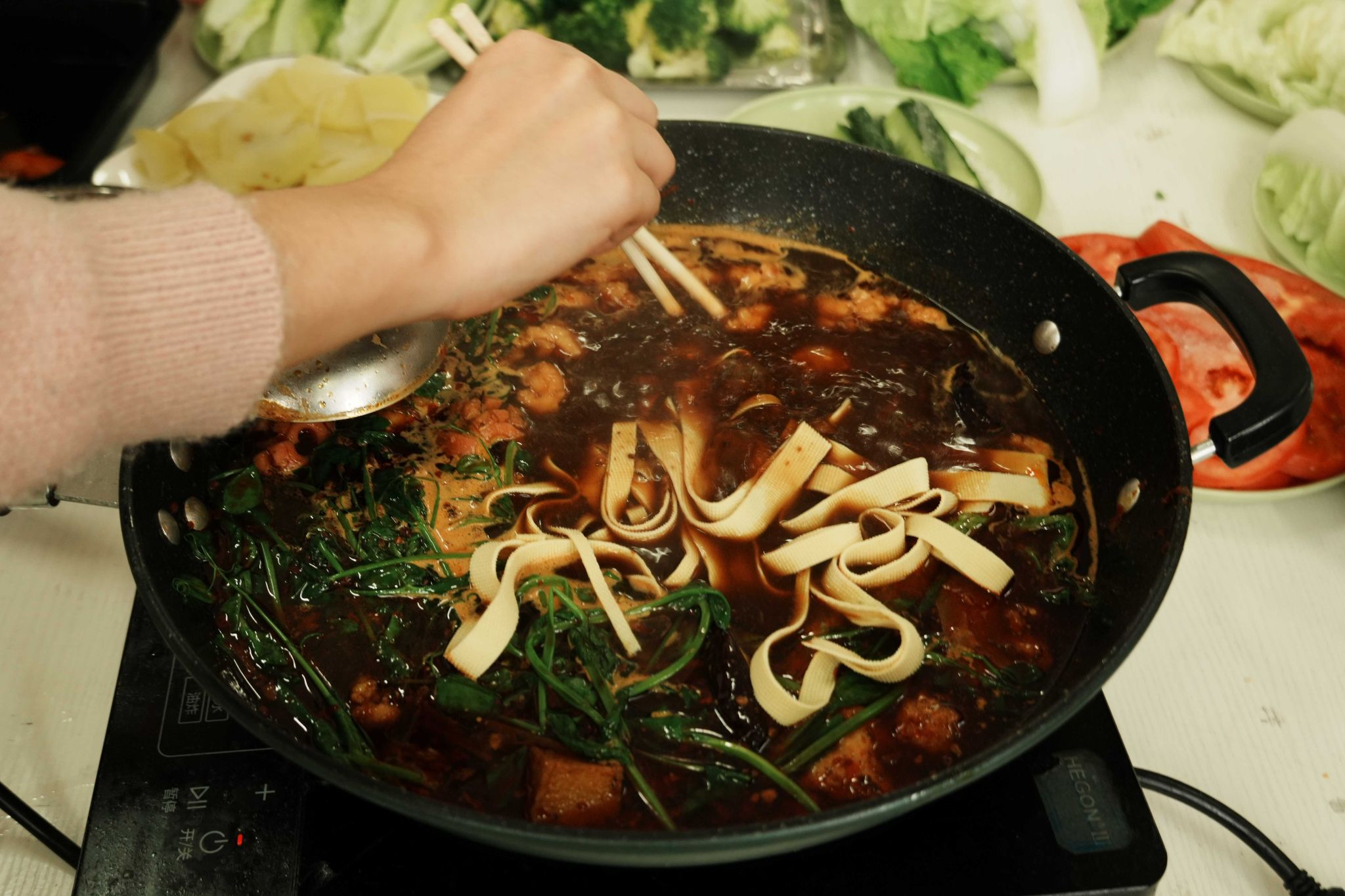 同学们将各种丸子进行焯水时,不知道是那个调皮的同学往锅里丢了一块火锅底料,哈哈哈想吃火锅的心愈发浓烈,就这样在这方温暖的角落,火锅蒸腾起的热气,氤氲着青春的欢歌笑语,一场由同学们共同演绎的火锅盛宴,也热辣启幕。在热辣滚烫的火锅旁,艺术传媒学院2024级广播电视编导3班的团队精神如同锅中升腾的热气一般,愈发浓郁、热烈。