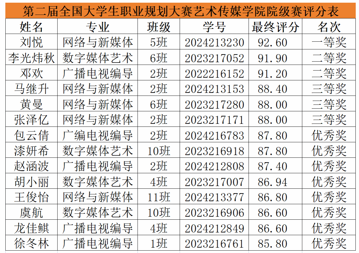 第二届全国大学生职业规划大赛艺术传媒学院院级赛评分表