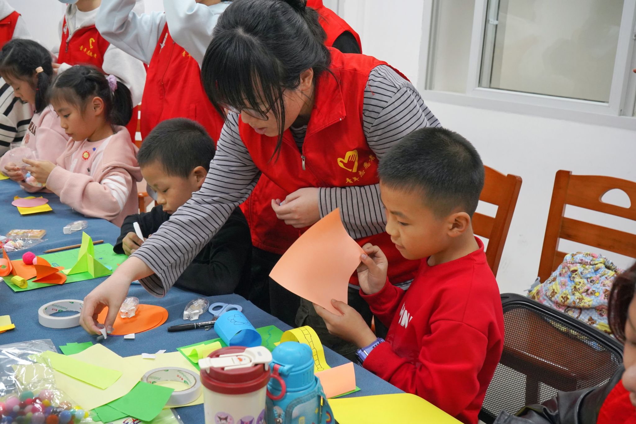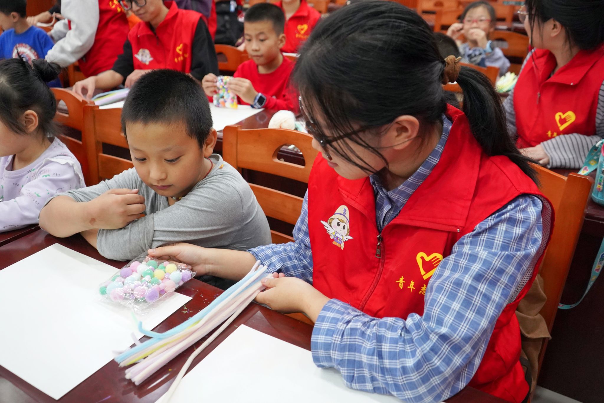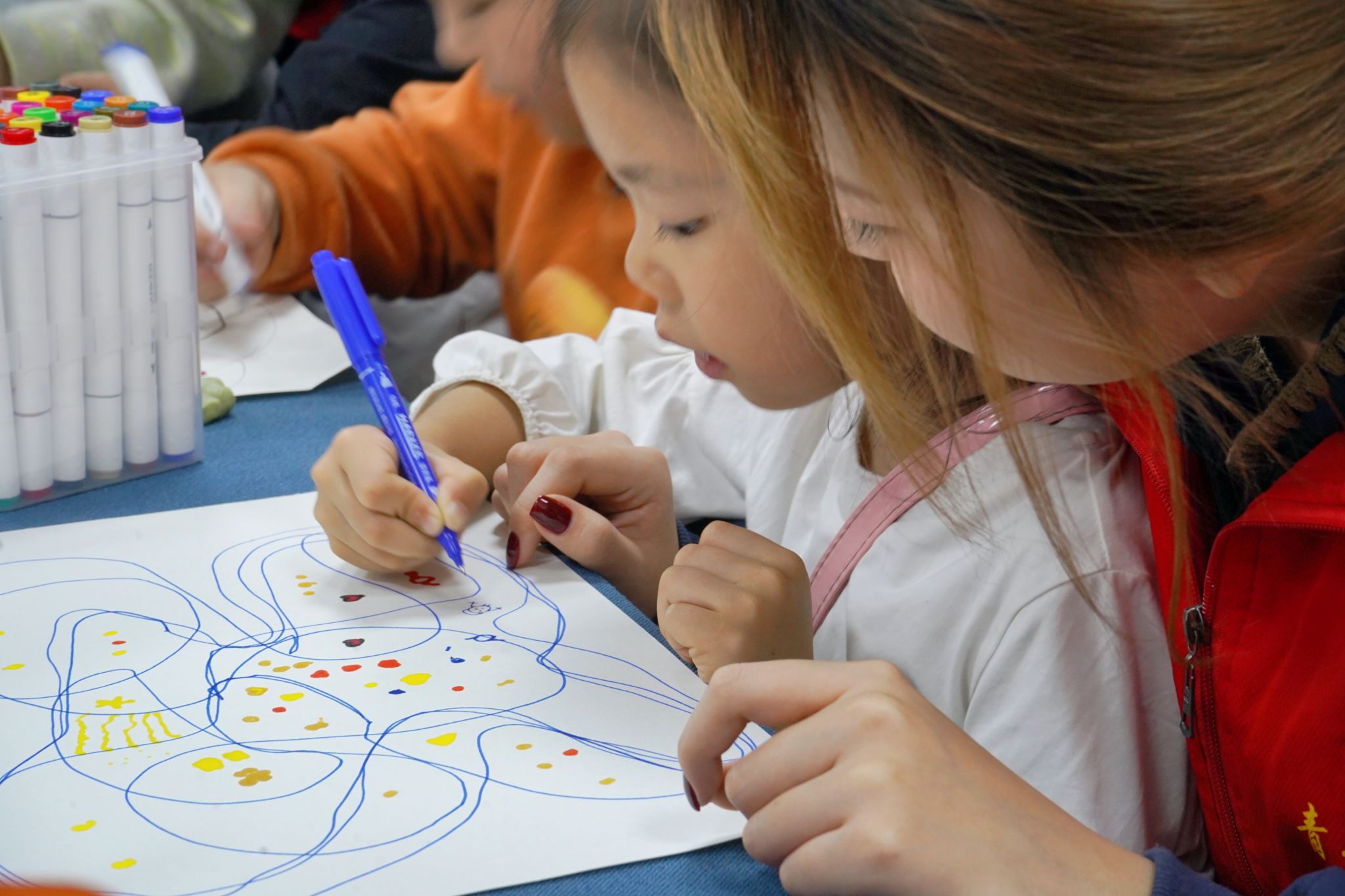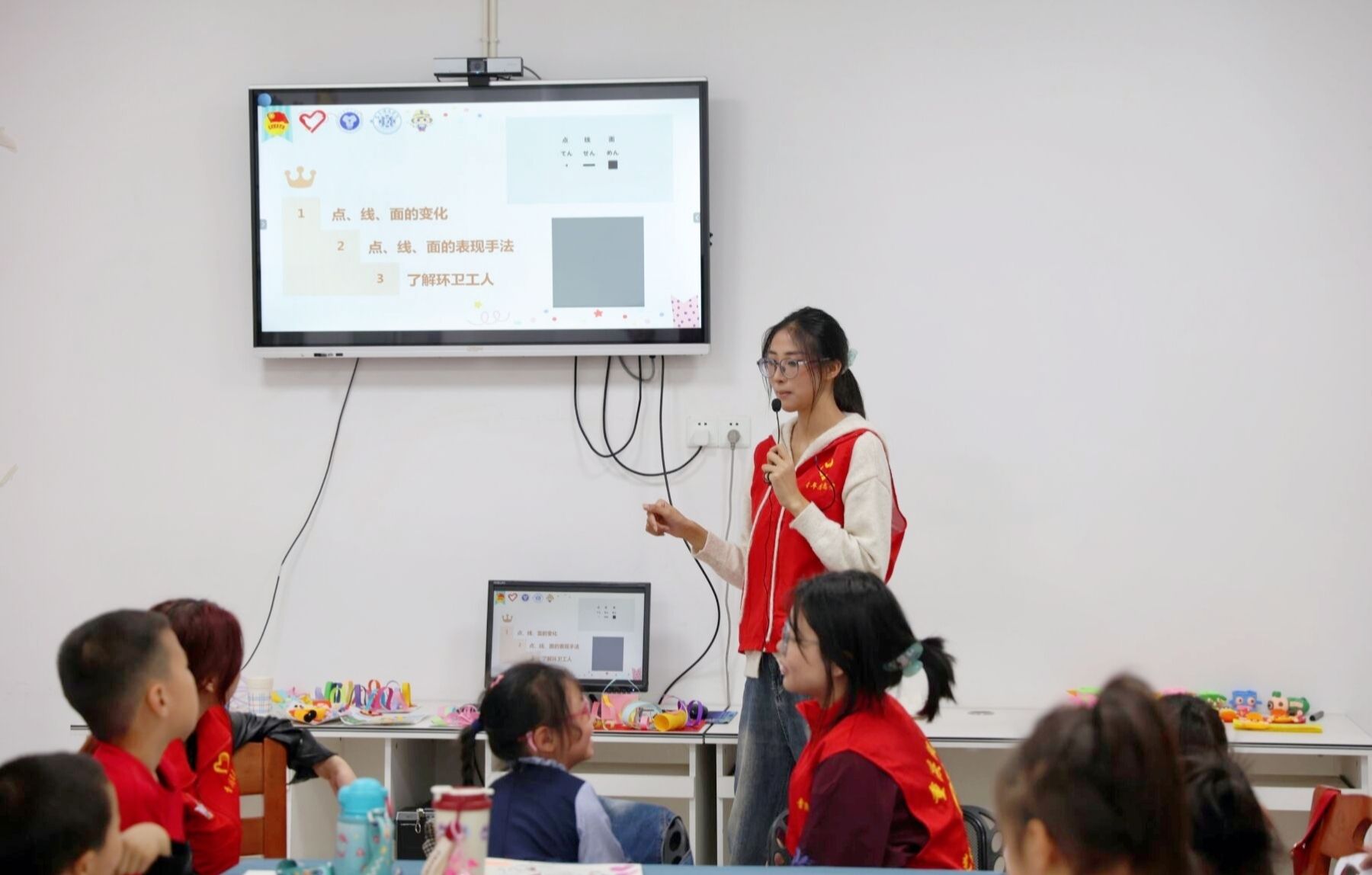 在小老师细致耐心的指引下,他们开始了充满创意的绘画和手工制作。绘画从最基础的元素“点”开始,志愿者们在一旁贴心地指导,鼓励小朋友们自己动手在画纸上进行绘画创作,在志愿者们的悉心陪伴与指导下,小朋友们发挥自己天马行空的想象力,创作出一幅幅关于环保主题的点线面绘画作品。紧接着,小朋友们又着手开始做半立体的手工作品,各种颜色的毛线小人、毛线小水桶、立体房屋等跃然纸上。最后小朋友们完成了作品并且进行了投票,最高票的小朋友也获得了志愿者亲手做的粘土小奖品。整个教室就像一个充满欢乐的艺术工坊。