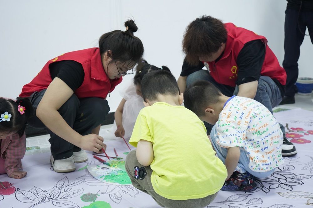 第三阶段,志愿者们组织的家风家教“梦想课堂”游园会成为全场高潮。在游园会上,志愿者们设计了一系列富有教育意义的小游戏,现场氛围热烈而欢快,小朋友们积极参与,争相展示自己的才华,也展示团队合作和竞技精神。此外,绘画环节更是吸引了众多小朋友的参与。在志愿者的陪伴下,他们手持画笔,在巨大的画布上尽情挥洒自己的想象力,共同绘制出一幅幅充满童真与创意的“梦想图”。志愿者们则在一旁耐心指导,为孩子们提供必要的帮助和支持。整个游园会现场热闹非凡,孩子们的欢笑声和呼喊声此起彼伏。