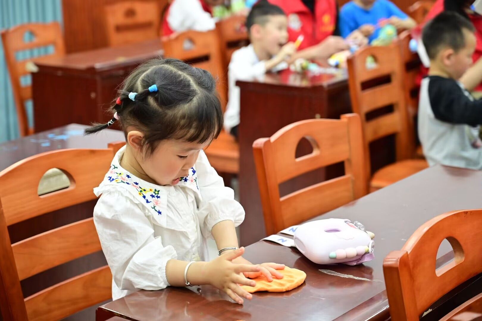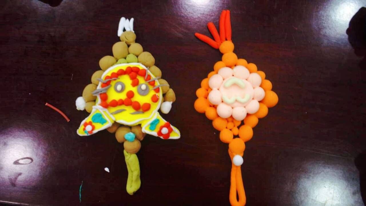 以手造物,以物寄情。在捏粘土环节,小朋友们在志愿者的指导下,认真学习黏土塑形技巧,彼此间交流互动,笑声不断。他们发挥自己的想象力,捏出了形态各异的粘土作品:有带着可爱兔子的中国结,传达出“千千结千千意”的美好寓意;有神形兼备的嫦娥和财神;有“沉睡三千年,一醒惊天下”的栩栩如生的三星堆。在他们的巧手下,小朋友们用黏土塑造出了精美的传统工艺品,体验了非遗技艺的独特魅力。