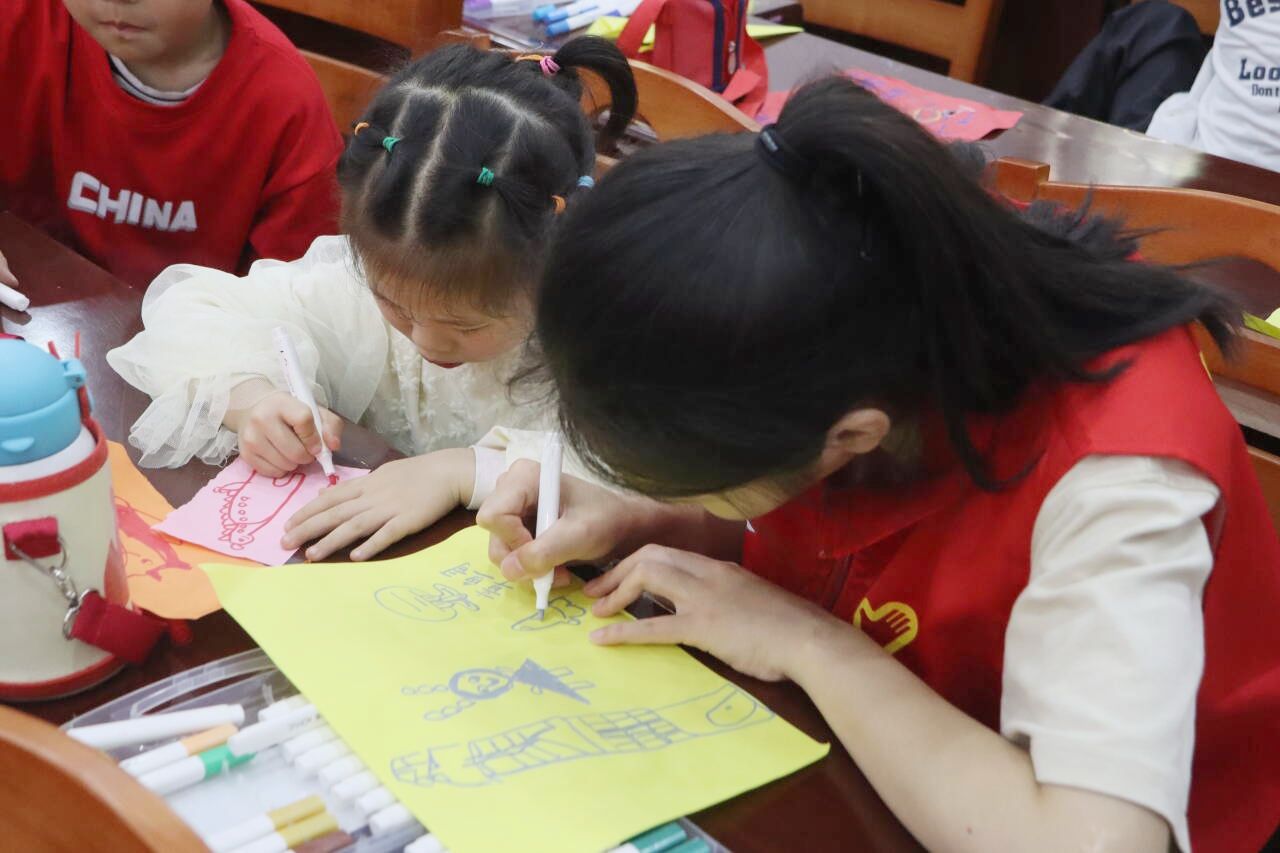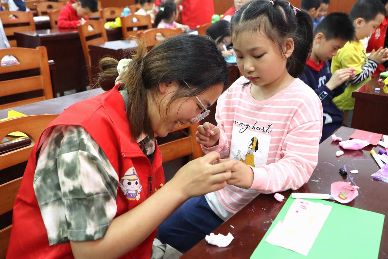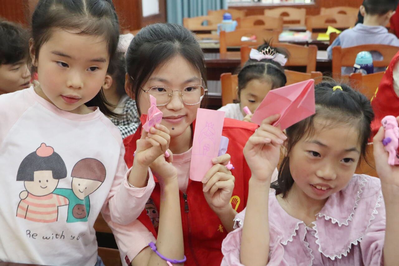 课堂上,小老师首先从折纸的发展、含义、工具、方式四个方面入手带领小朋友们叩响了折纸文化教育的大门。目光所及,每个小朋友都挺胸抬头、专注地听课,小小的脑袋,大大的眼睛,渴求探索的眼神,在小老师和志愿者们的积极引导下,活泼可爱的小朋友们也踊跃举手发言。随着课堂的开展,志愿者引导小朋友用彩色卡纸创作关于折纸的艺术作品。有的小朋友贯彻自己想做一名的船长的愿望,折出各式各样的船只;有的小朋友更喜欢活泼可爱的小动物们,一只只可爱的小猫小狗通过折纸的方式在他们的手中活灵活现。一个个别具一格的作品在小朋友们的创作下呈现在大家面前。小朋友们完成了自己的作品后,带着自己的作品热情和志愿者们合照,他们的脸上也露出了灿烂的笑容。