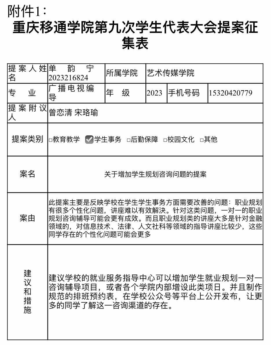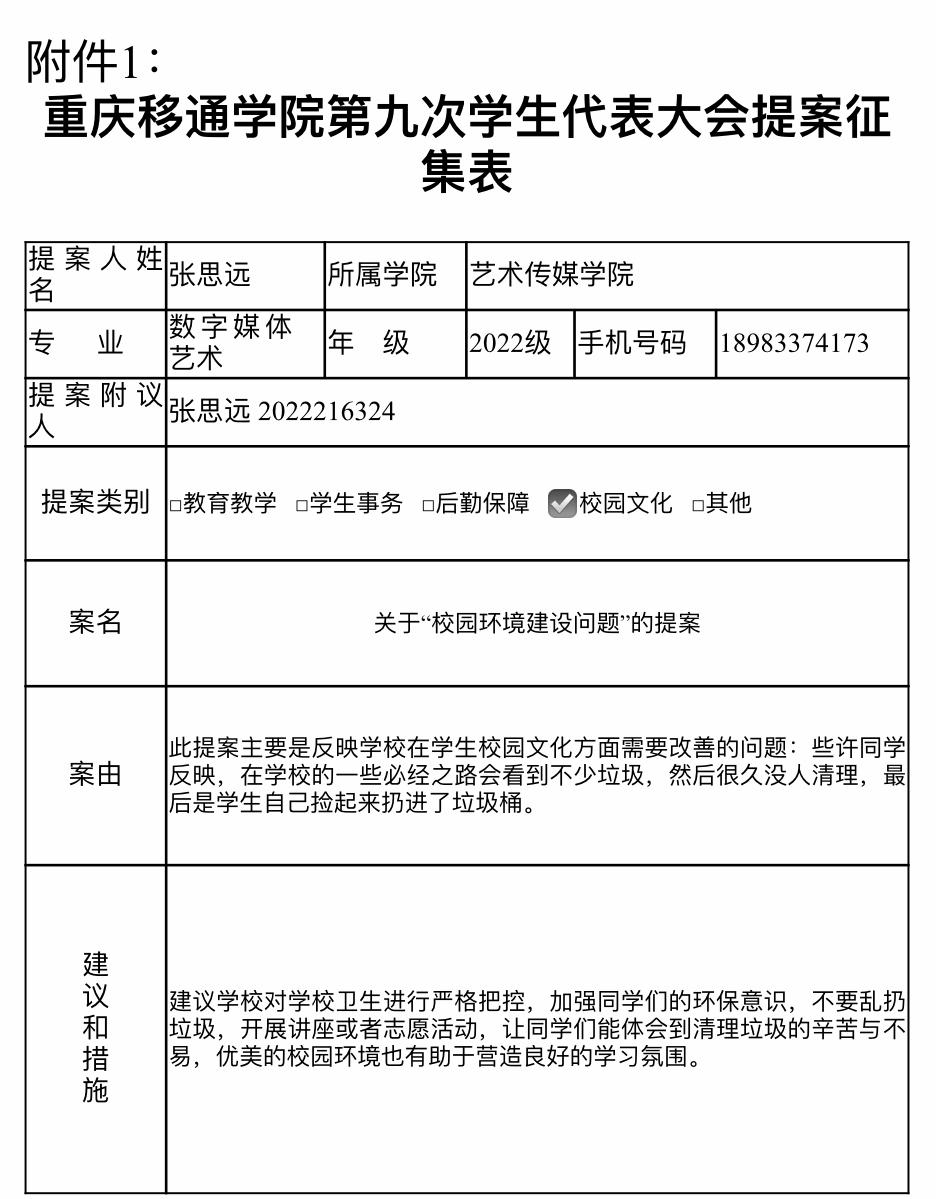 活动伊始,面向全院学子的提案征集主要分为四个方面。其中,校园文化方面,同学们主要从社团活动的举办以及学院环境建设等方面出发,提出自己的建议,希望共同建设一个美丽干净的学习、生活环境,提高艺传学子们在院内的幸福指度、舒适度。如:同学们提出建议对学校卫生进行严格把控,加强同学们的环保意识,不乱扔垃圾,建设美丽的学院环境,展现出同学们的主人翁意识,更是完满教育观念影响下的完美体现。