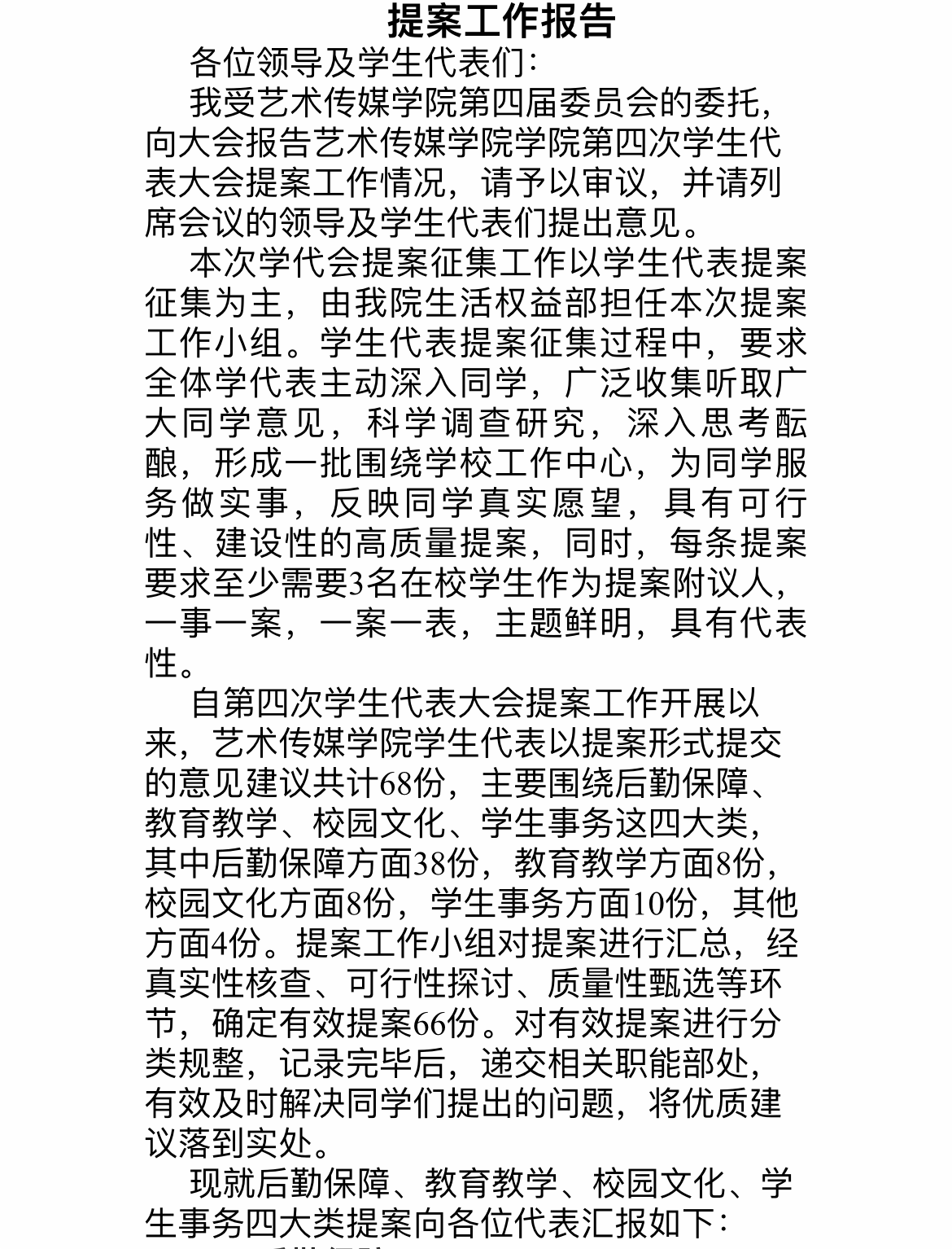 3月24日至4月3日,重庆移通学院艺术传媒学院生活权益部就此展开“艺术传媒学院2024年‘学代会’提案征集”。本次活动采取线上提交提案,提交的意见建议共计68份,主要围绕后勤保障、教育教学、校园文化、学生事务这四大类,其中后勤保障方面38份,教育教学方面8份,校园文化方面8份,学生事务方面10份,其他方面4份。