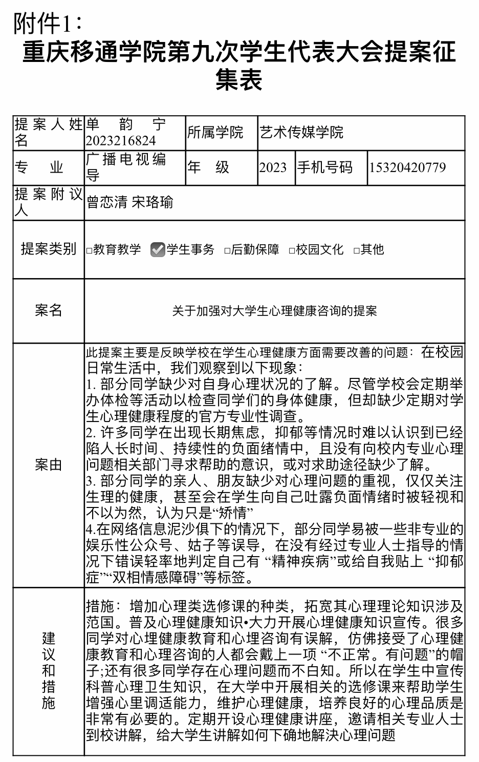 此外,落实到学生事务方面,艺传学子们踊跃提出与大学生心理健康的咨询以及学生自我规划咨询等的提案。大家建议增设这类有助于自身发展的咨询室,及进行相关问题的解答以及如何保持良好积极向上的心态,或在学校公众号以及各平台上发布关于学生咨询的辅导项目,让更多的同学了解到这一渠道。为学院培养全能型人才贡献出一份力量,同时表现出书院制大学办学理念对于本院学生心理健康方面的重大关注。