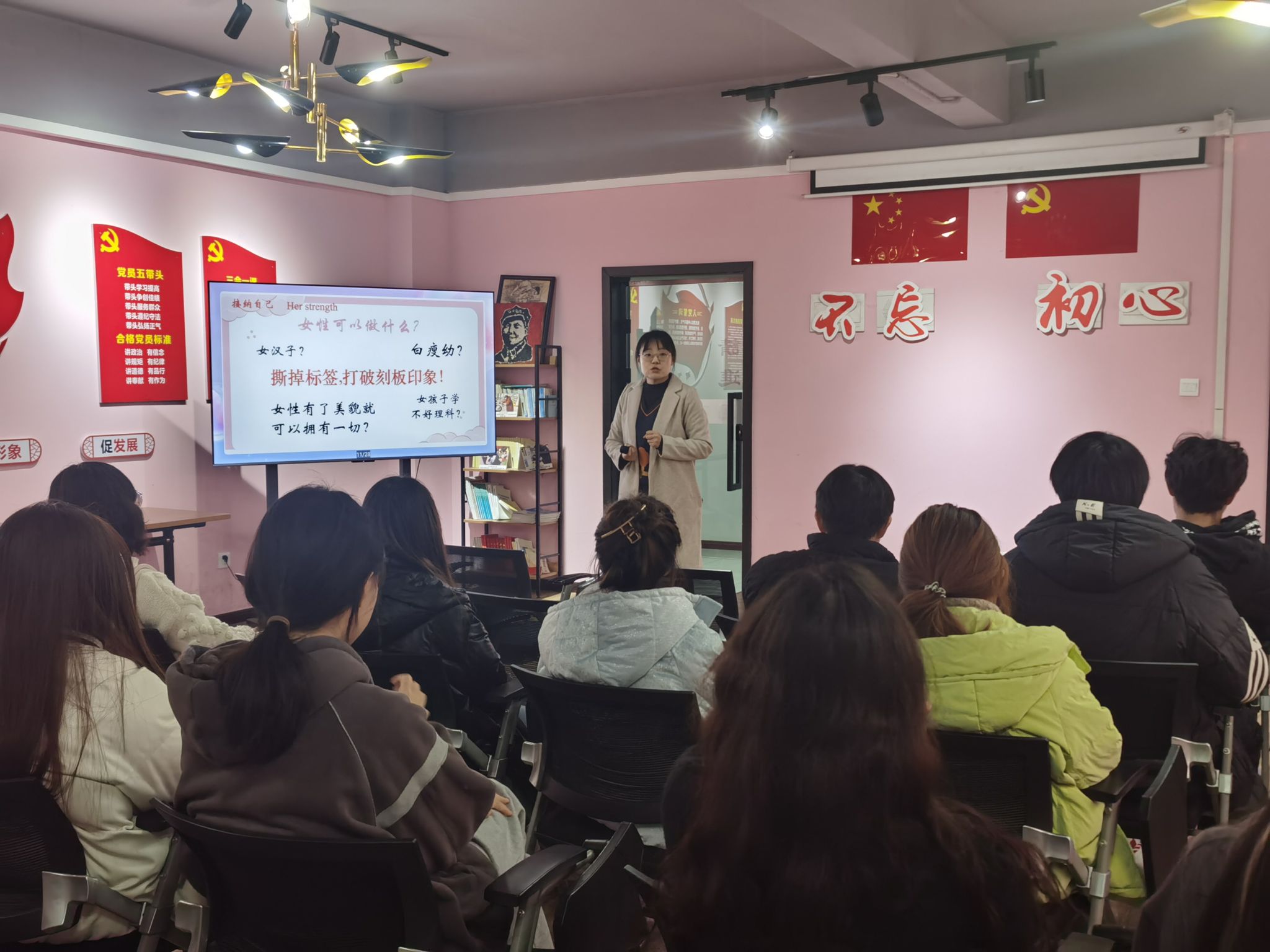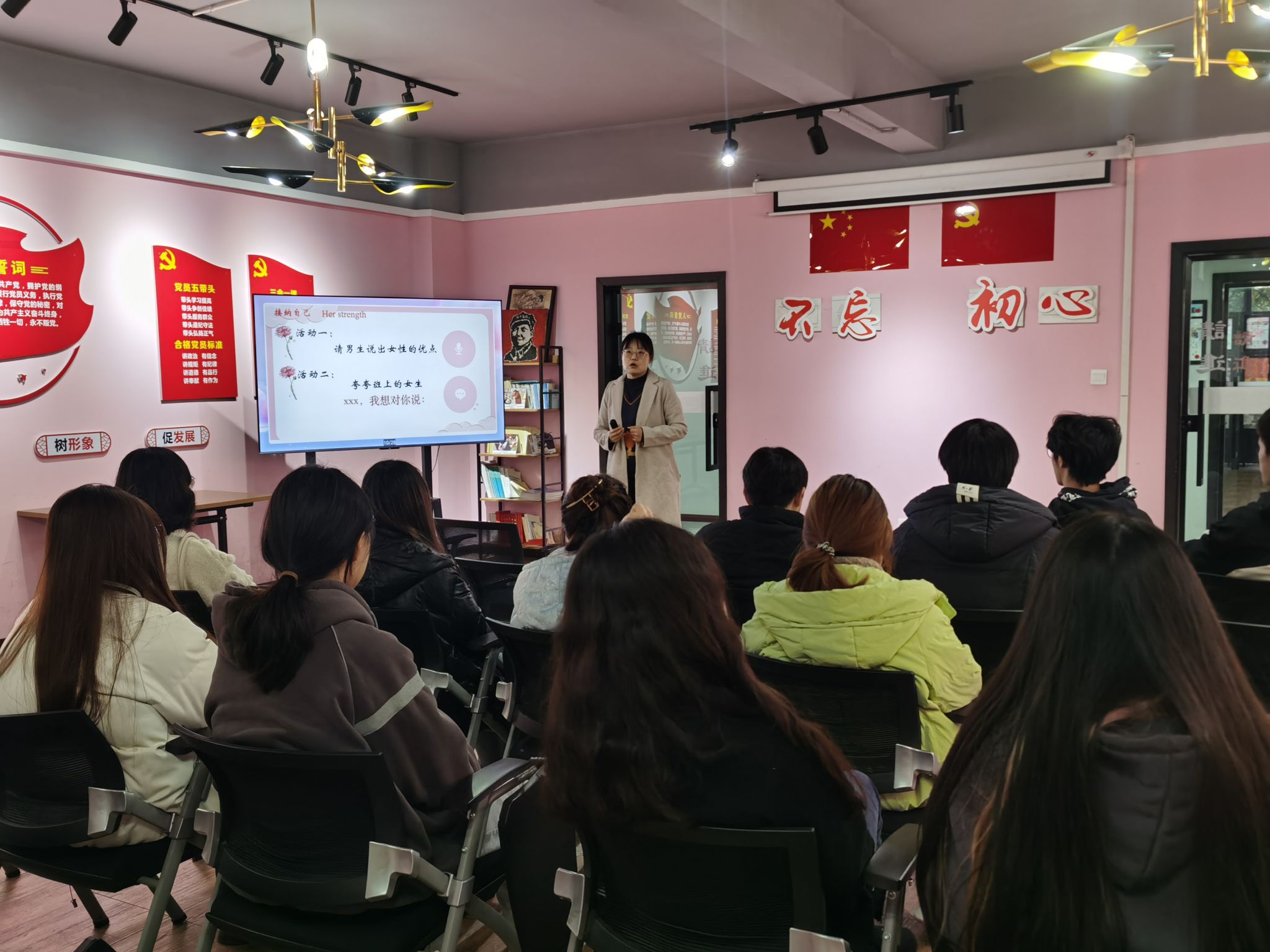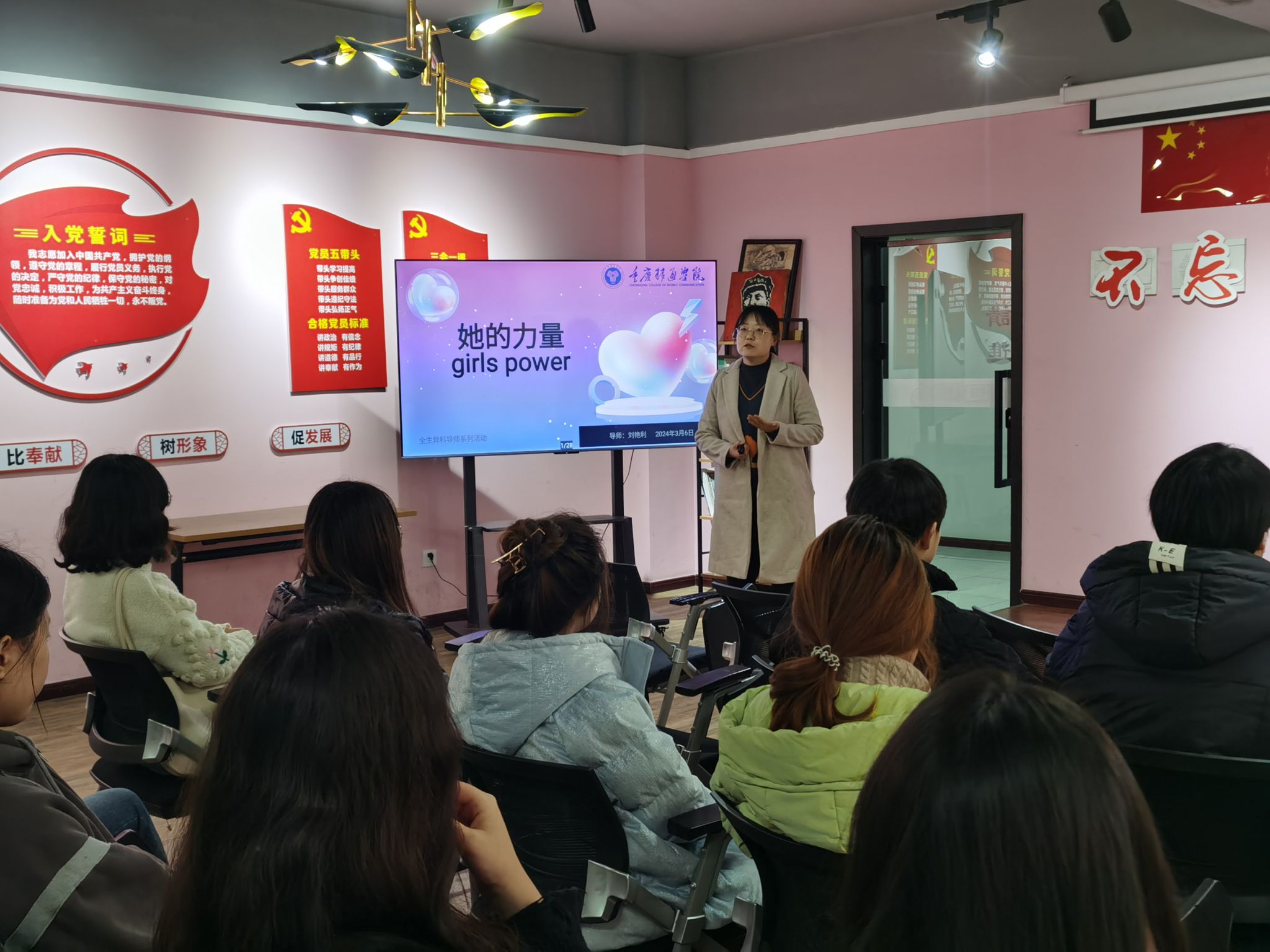 三月伊始,春暖花开。在这个充满生机,繁花待放的美好时节,我们迎来了第114个“三八”国际妇女节。为了加深同学们对节日意义的了解,营造和谐美好的节日氛围。3月6日下午6点,异科班导师刘艳利与艺术传媒学院2023级数字媒体艺术专业1、2班部分同学相聚于爱莲书院语言交流室,开展“她的力量”三八妇女节主题活动。
