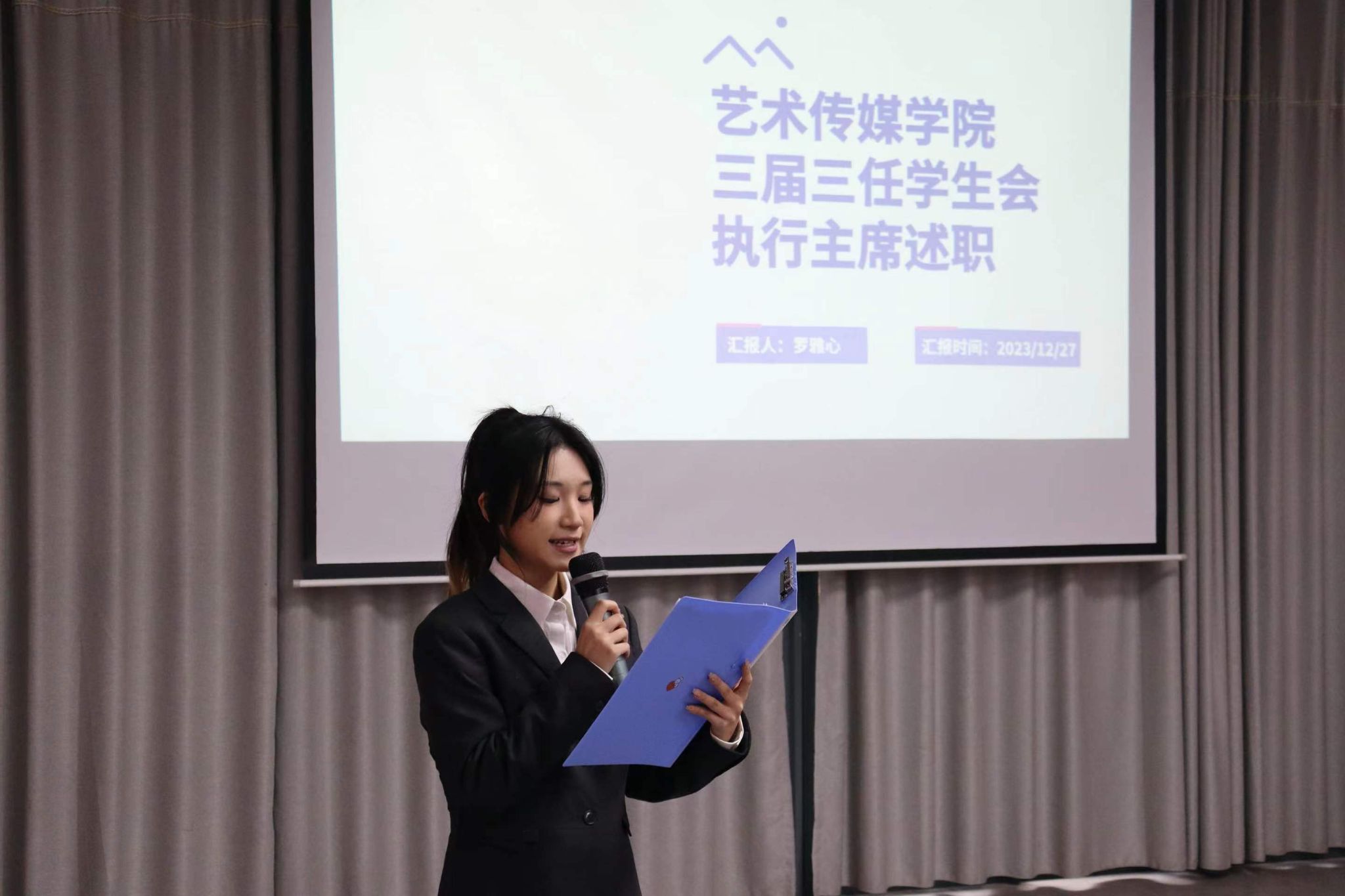 大会在奏唱《中国共产主义青年团团歌》中拉开帷幕。紧接着,学院团总支学生副书记和执行主席对一学期的工作进行了述职回顾。两位团总支学生副书记通过一系列数据复盘,将本学期的团学与宣传工作进行了总结,并表示将来会继续推动部门内部建设与干事能力提升。学生会执行主席张入丹提到:“本学期组织‘追忆’合唱团参与第十五届校园合唱大赛,最终荣获第一名的佳绩。”青年志愿者协会执行主席郑甜甜表示,本学期艺术传媒学院青年志愿者协会在原有美益约志愿服务“5+N”的基础上,不断优化升级,创新形成美益约志愿服务“7+N”新体系。本次述职回顾了本学期的主要工作成果,也对工作不足进行了反思,同时也总结了工作经验以及未来重点工作计划,相信艺传在大家的共同努力下会建设得越来越好。