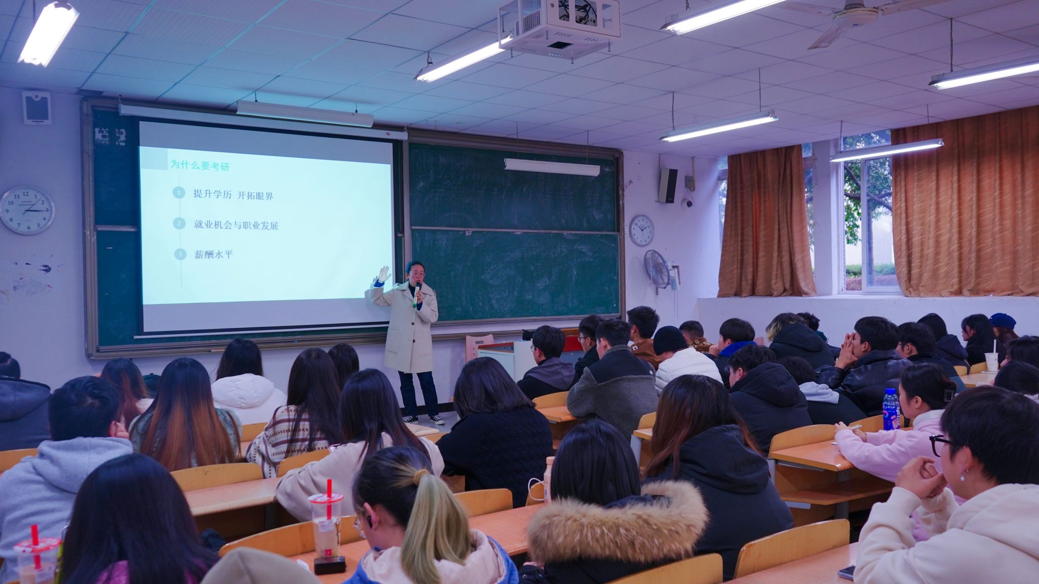 活动伊始,李文老师先通过自身考研、考博经历进行分享,鼓励同学们积极升学,提出考研不仅能提升学历、开拓眼界,增加就业机会与职业发展能力,提高工作薪资水平。并在此基础上嘱咐同学们考研前期需要明确自己的目标,同时要对自己的考研之路有具体的规划,只有目标规划明确,同学们才能在升学之路上一往无前。