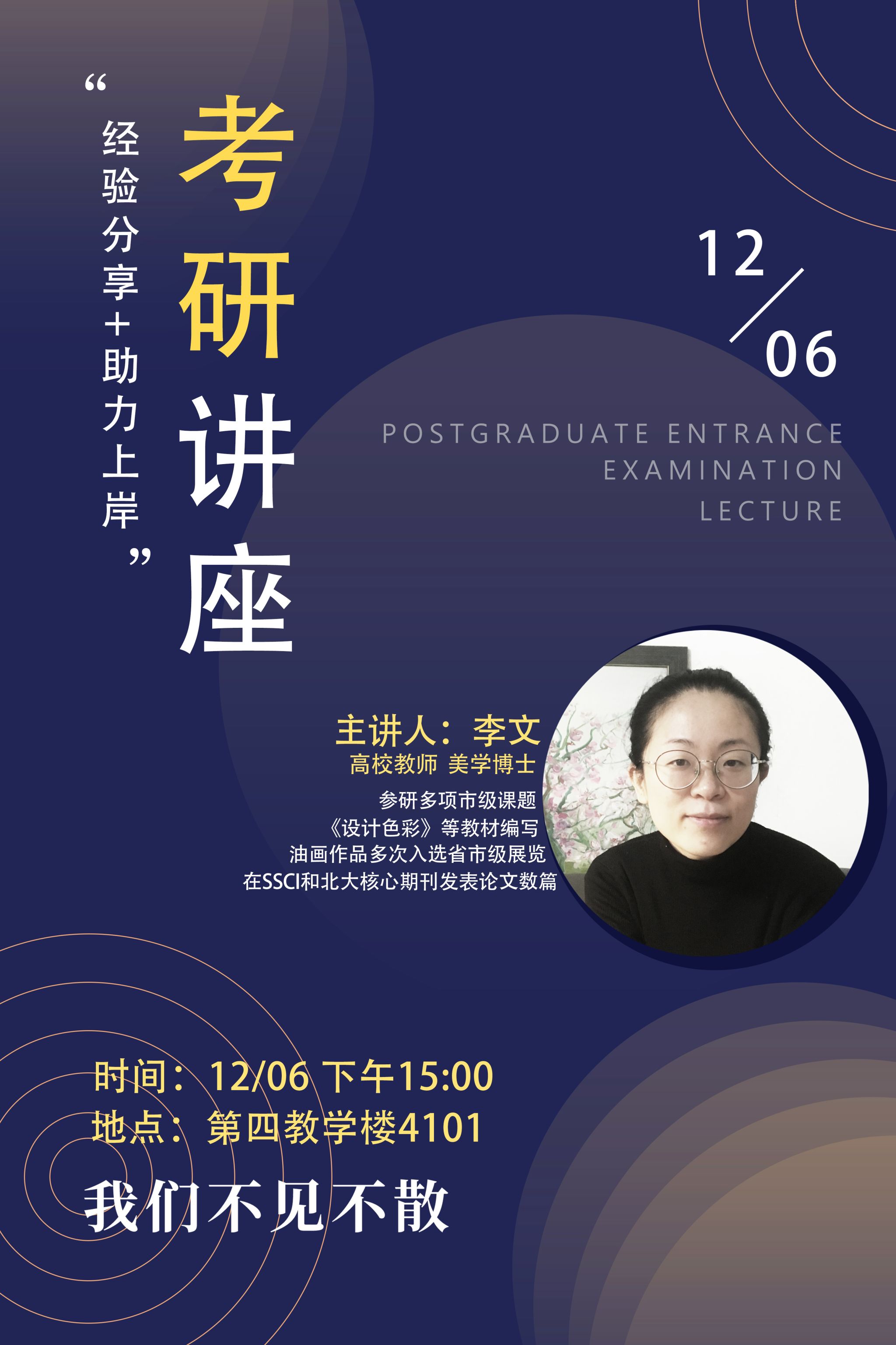 2023年12月6日下午15:00,艺术传媒学院于第四教学楼4101举办了考研分享讲座,由美学博士李文老师为同学们做考研分享,李文老师现为高校教师,曾参与过多项市级课题,在SSCI和北大核心期刊上发表论文数篇,并参与《设计色彩》等专业教材的编写,此外油画作品多次入选省市级展览。