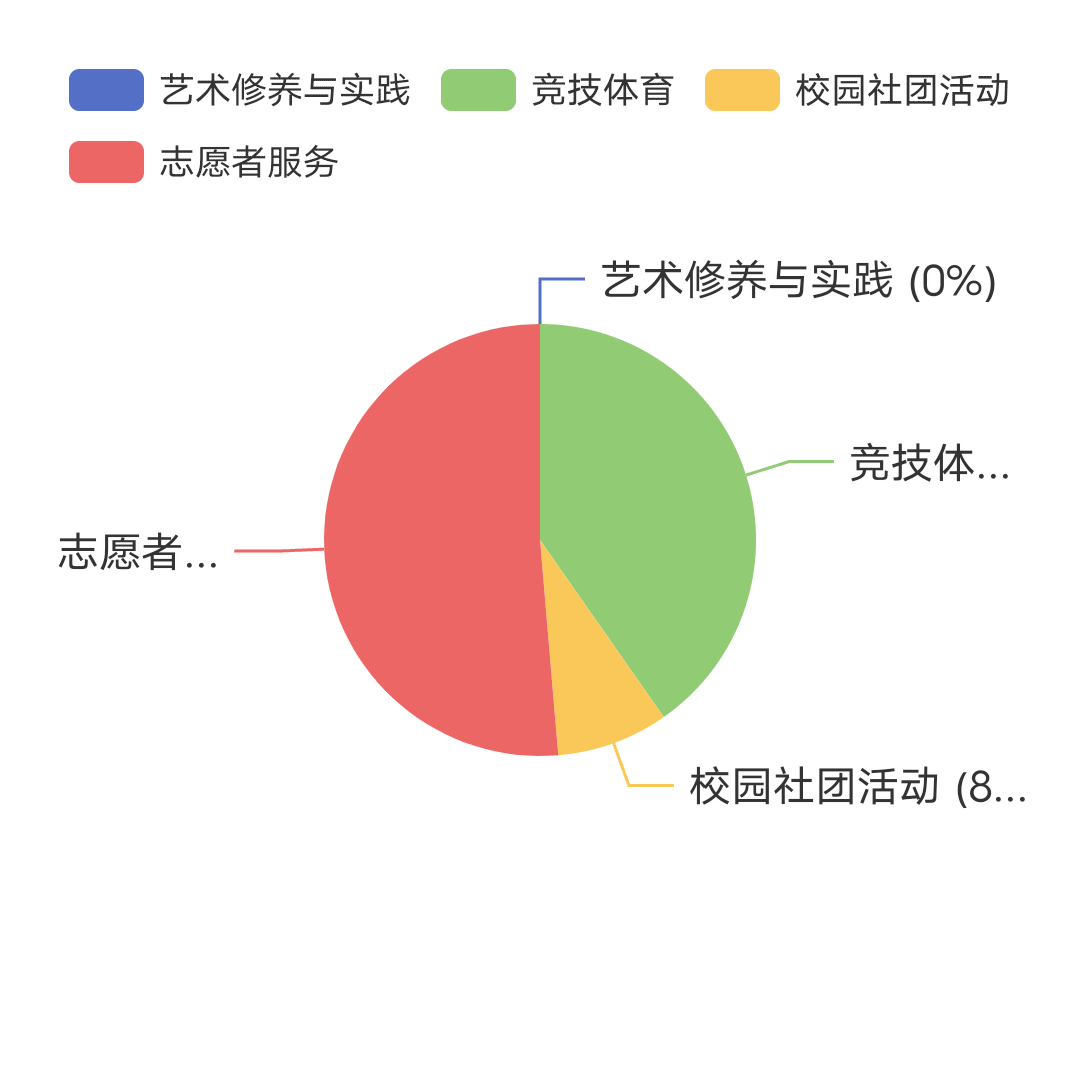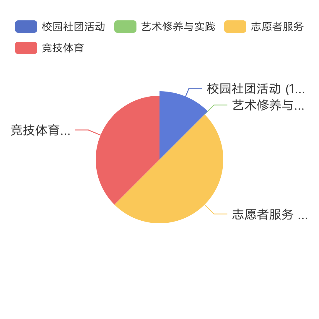 完满教育活动中,志愿者服务类与竞技体育类活动参与人数最多。志愿者服务类571人次,平均每场48人次;竞技体育类448人次,平均每场50人次。