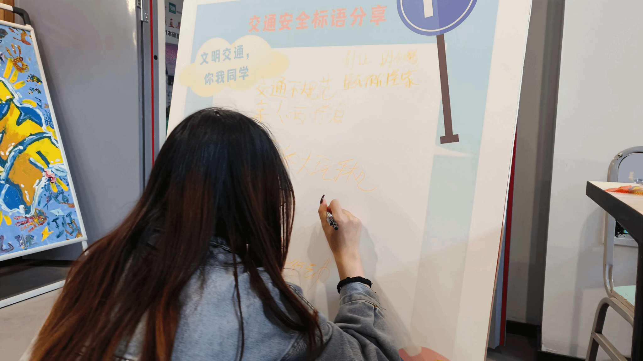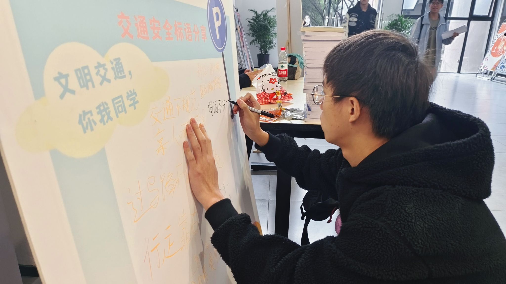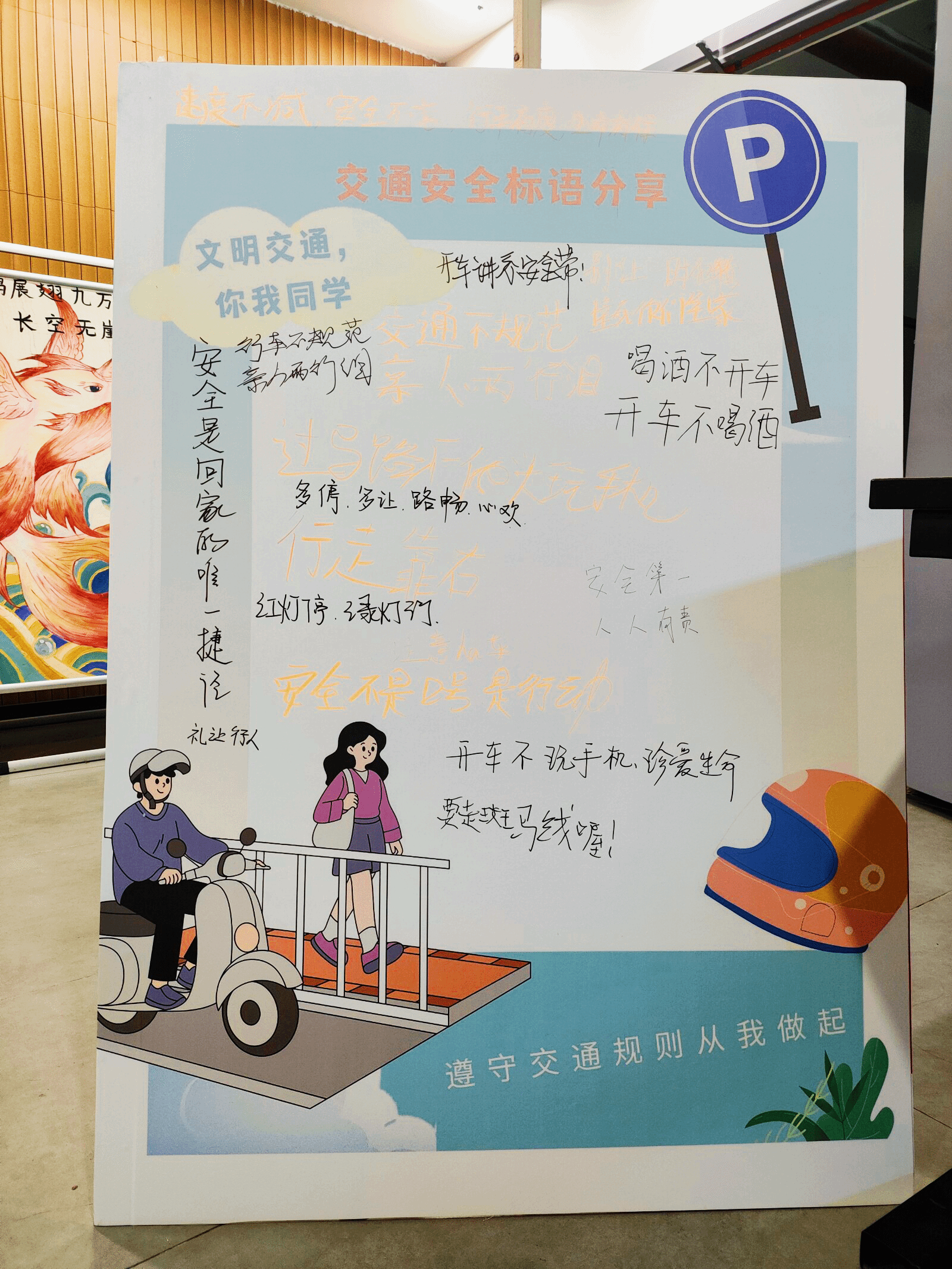 接下来,艺传学子在答题过程中也积极的与工作人员深入讨论与交通安全相关的话题,这使得艺传的学子掌握了相关的交通安全知识,养成自觉遵守交通规则的良好习惯。答完题之后,大家在“交通安全标语分享”的展板纷纷留下文明出行的小贴士,将更多的交通文明常识分享给更多的同学,形成“一个同学带动一个团体,一个团体带动全学校”共同关注交通安全的氛围,让每个人成为文明交通的宣传者、倡导者和践行者。