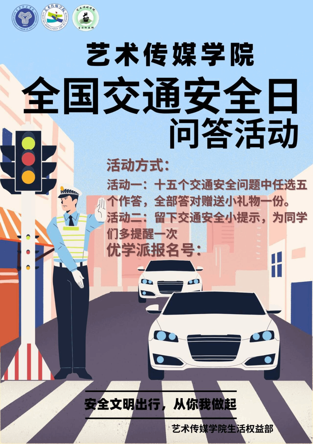 为提高艺术传媒学院学子的艺术修养和综合素质,更好的了解交通安全知识,培养同学们的交通安全意识。艺术传媒学院生活权益部在12月5日下午14:00-18:00在第八教学楼门口特举办此次“全国交通安全日”问答活动。此次活动由合川校区艺术传媒学院全体学子参加。