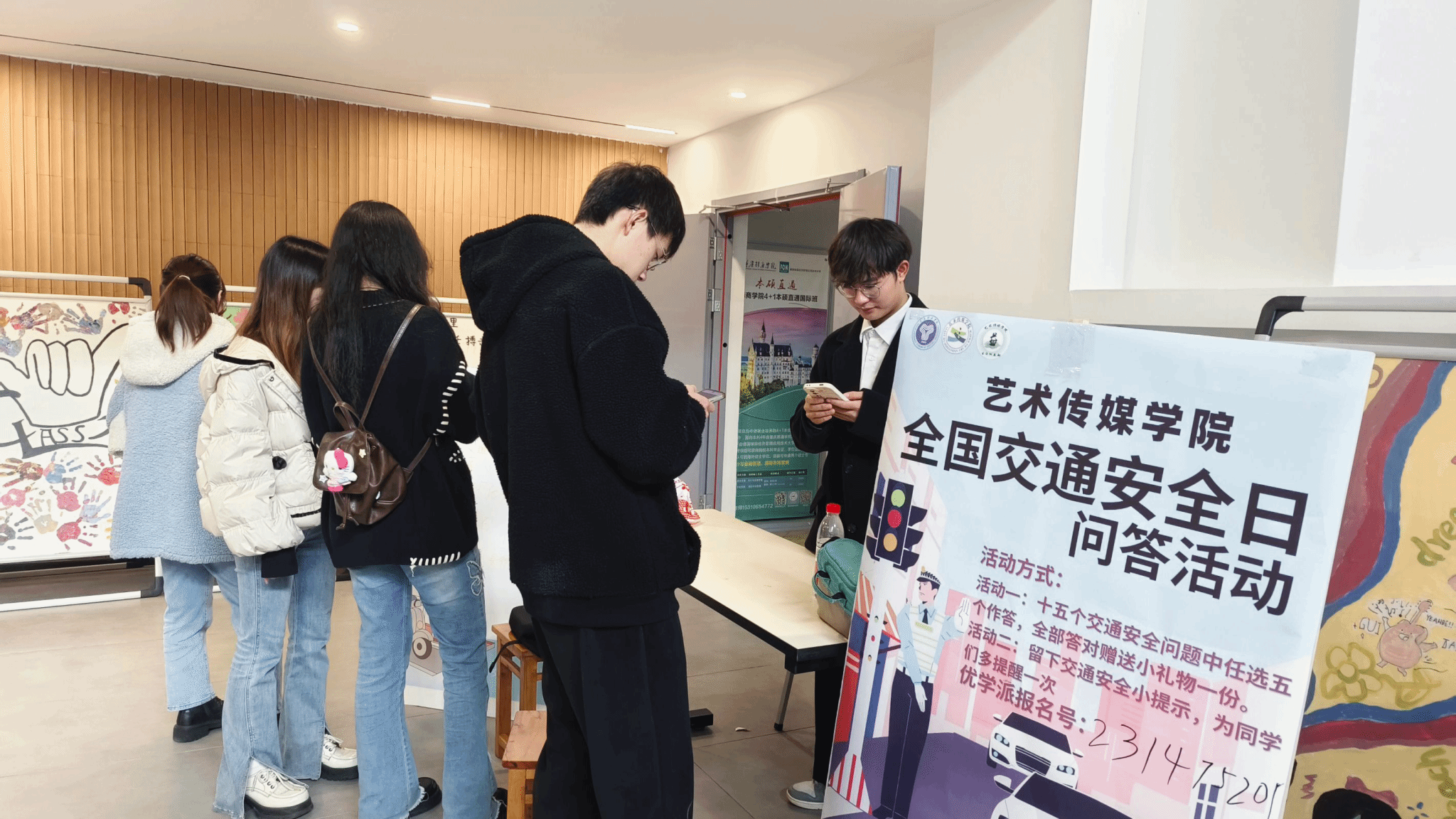 艺术传媒学院生活权益部为这次活动准备了多种宣传类型,通过悠学派线上活动发布和线下现场宣传,深入为同学们普及“全国交通日”以及交通安全知识等。活动伊始,艺传学子被展板所吸引,在工作人员的指导下积极踊跃排队参与到本次交通安全知识问答活动当中,氛围活跃且秩序井然,展现了艺传学子们良好的精神风貌。