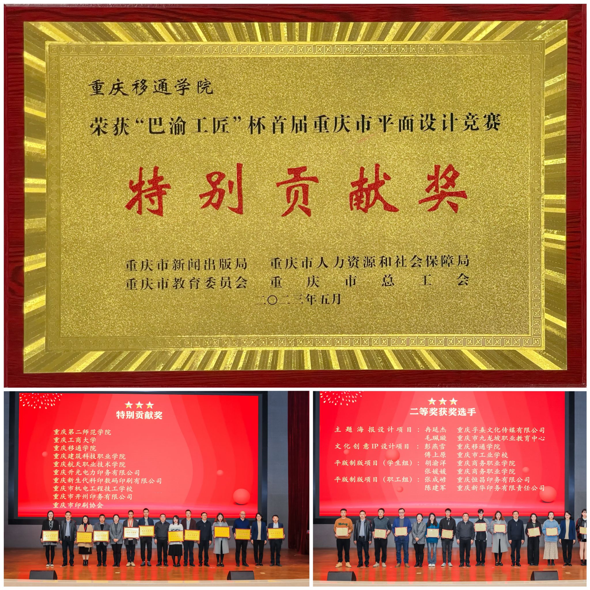 “巴渝工匠”杯首届重庆市平面设计竞赛设置了主题海报设计项目、文化创意IP设计项目、平版制版项目(学生组)、平版制版项目(职工组)四个赛道,吸引了全市多个院校以及各类平面设计单位的参与。重庆移通学院师生积极也参与此次竞赛,凭借扎实的专业知识,出色的创新思维,充分展示了重庆移通学院的教学质量和师生的综合素质,赢得了评委们的一致好评,斩获文化创意IP设计项目二等奖。同时也因各位师生在比赛中的突出表现,重庆移通学院获得了本次大赛的特别贡献奖。