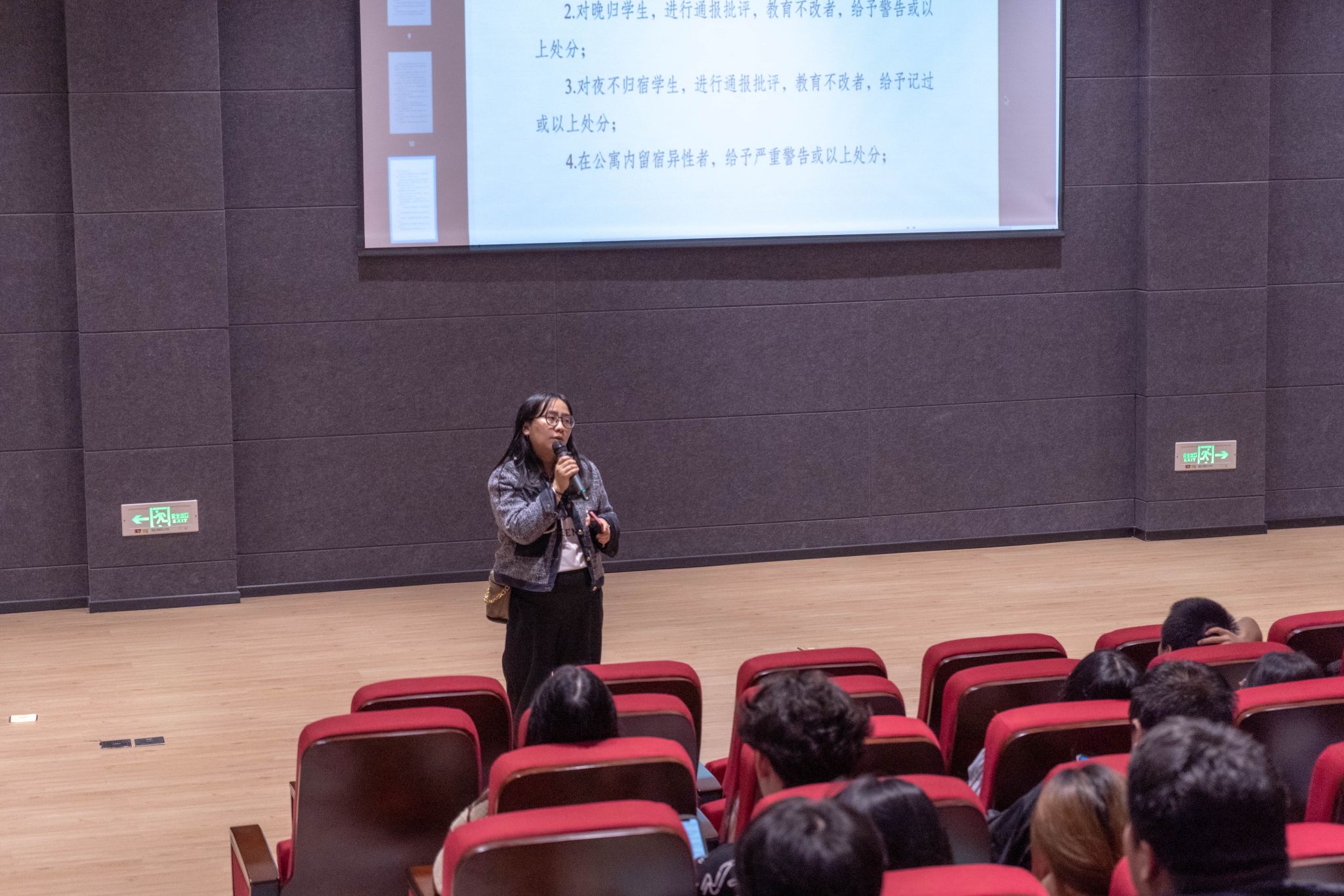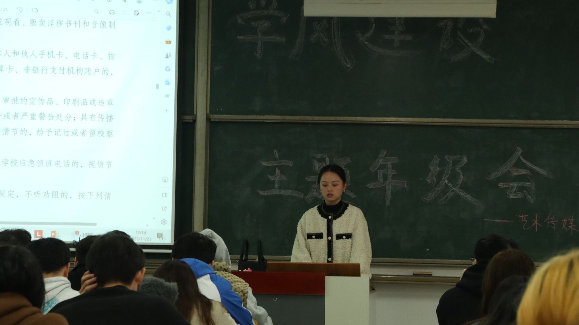 2023级专升本及2021级广播电视编导8班辅导员孟易老师,以文件条款为依据并结合具体案例进行解读。特别强调了对于窃盗偷窃、代课代寝一系列违规行为的惩处。2023级广编电视编导、网络与新媒体专业辅导员黄小梅老师,解读了学校处分的种类和应用,违纪行为的调查处理与组织实施,以此提高同学们的规则意识。