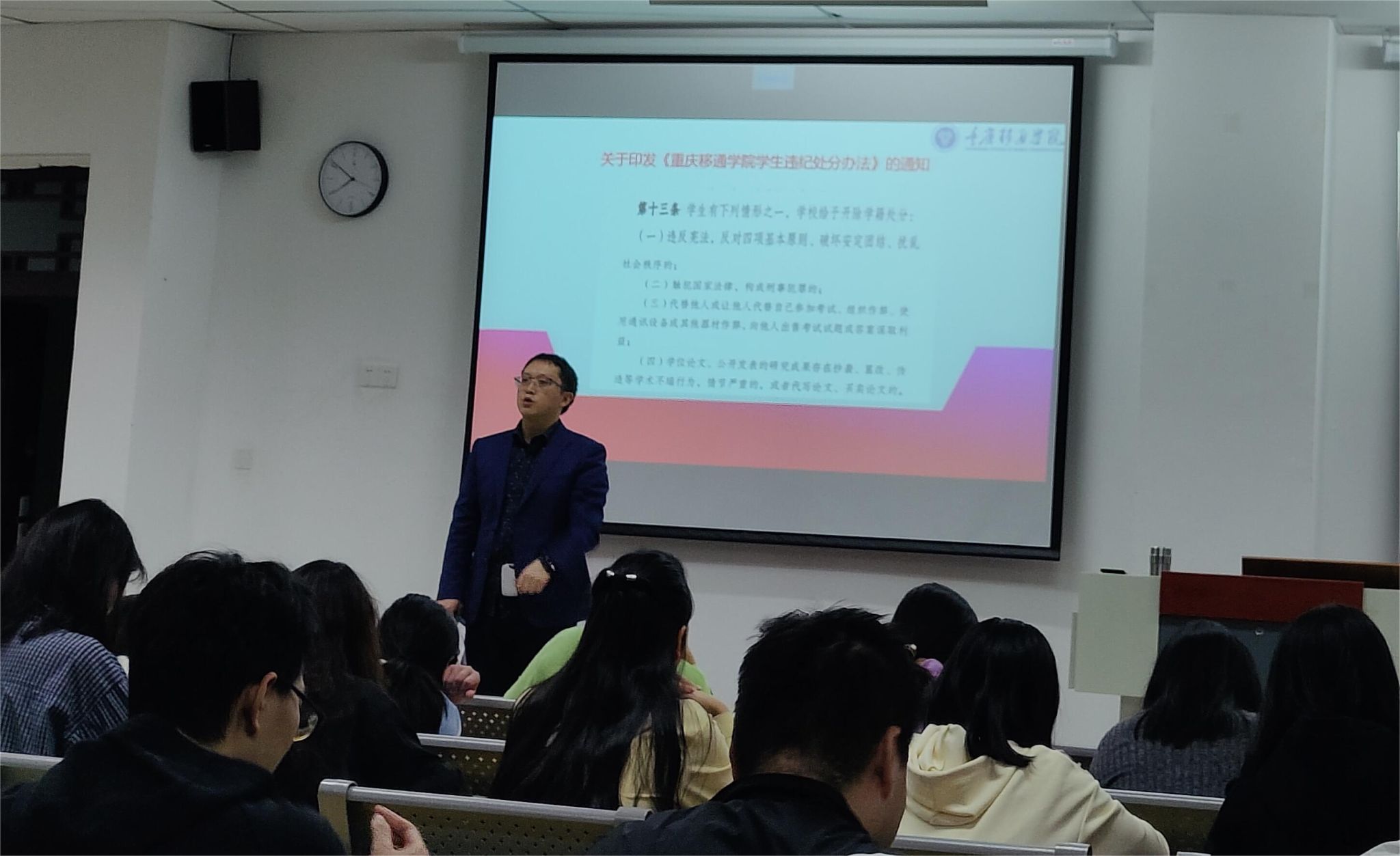 为塑造优良的院风、学风和班风,促进学生德智体美劳全面发展。艺术传媒学院11月期间组织各年级专业开展警示教育专题活动,通过“文件解读、案例研讨、警示分析”等多维的学习形式,组织全体同学广泛学习和解读《重庆移通学院学生违纪处分办法》。