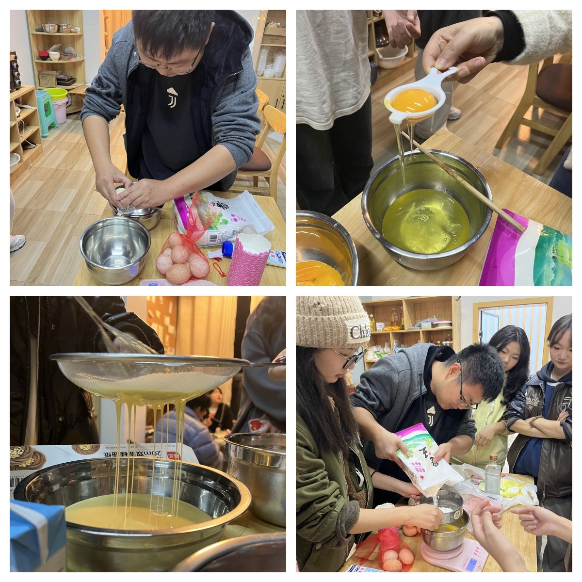 活动开始后,千禾烘焙工坊的社团成员向大家介绍了要做的蛋糕类型、用料和操作用具,一边细心讲解制作方法,一边现场操作,大家迫不及待地跟随着步骤亲自动手。将蛋黄与蛋清分离,按比例搭配各种配料,大家一边操作一边欣赏各自的作品并拍照留念,现场充满了欢声笑语。