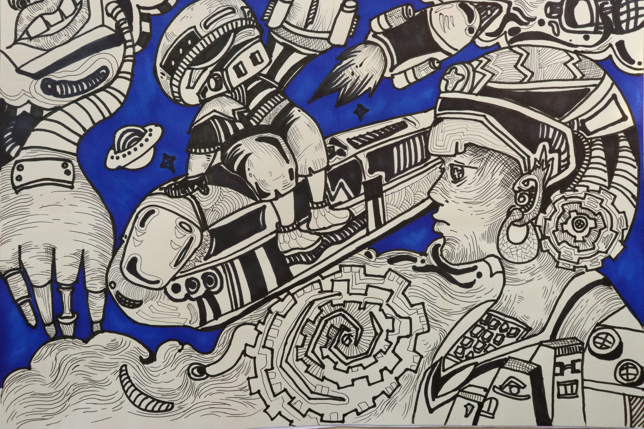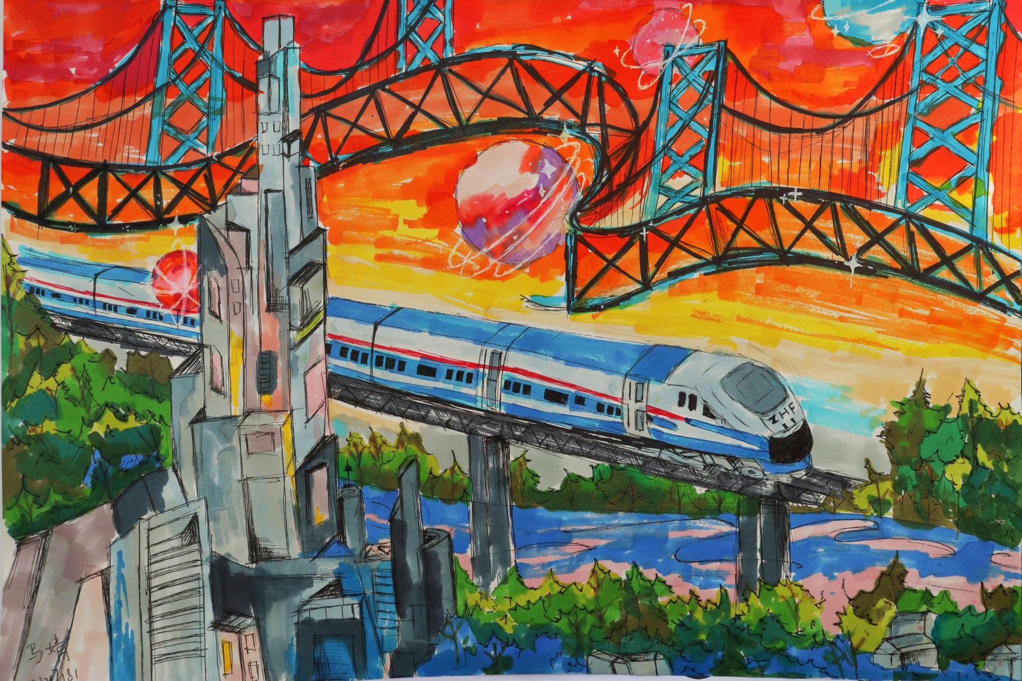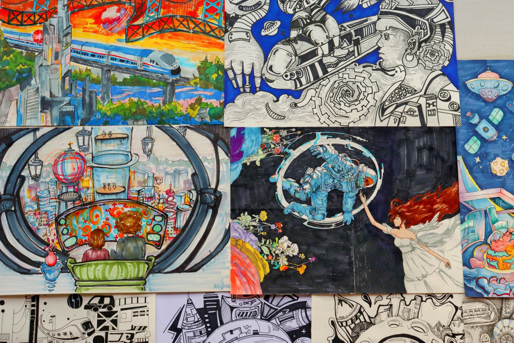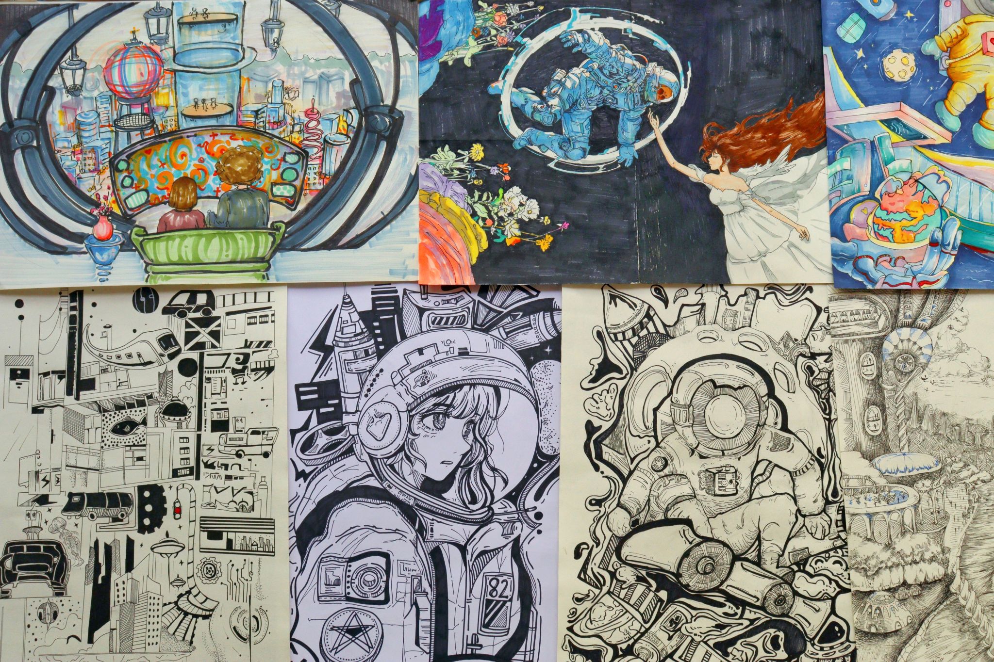 在这次比赛中,同学们充分展示了自己的才华和创意。这些作品中不仅描绘出了一个高度发达的科技世界,人类通过虚拟现实技术实现瞬间穿越;还有关注环境保护,呼吁人们珍惜地球资源,共同守护家园的作品;甚至还有的作品关注到了人类的发展,设想了一个没有疾病、贫困和战争的和平世界……这些作品不仅充满了对美好未来的向往,也反映了同学们对未来世界和科技发展的关注和思考,他们用画笔肆意挥洒着自己想法,用一幅幅画卷展现科技与生活的交融。