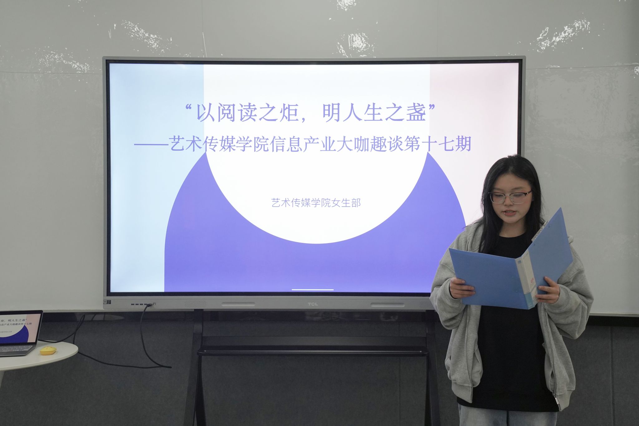 卡尔·塞根曾言“书籍是人类思想的宝库,阅读是开启这个宝库之门的钥匙”强调了阅读是作为知识传承的重要工具。每一本书都是前人思想的结晶,是对历史的解读,是智慧的积累。通过阅读,我们可以汲取前人的经验和教训,将他们的智慧传承下去,成为自己的成长积累宝贵的知识财富,这不仅是对过去文明的尊重,更是对未来发展的贡献。艺术传媒学院女生部于2023年11月24日在南湖书院三号楼中德创意工坊开展“以阅读之炬,明人生之盏”为主题的大咖阅读活动,以宣讲会的形式让同学们明白阅读的重要性,在环境的督促下能够自觉形成阅读的习惯,与大咖共度大学时光。