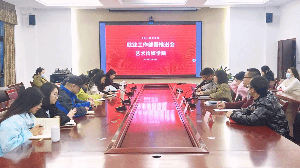 为了进一步做好艺术传媒学院就业工作,学院于2023年11月15日开展了2024届毕业生就业工作部署推进会,对学院就业工作进行了全面的安排部署。艺术传媒学院院长李轶天,就业创业指导与服务中心主任助理杨德龙,教研室主任廖国臣、曹洋洋,就业创业工作办公室主任胡磊出席本次会议,全体辅导员和论文指导教师参加会议。会议由艺术传媒学院学工副院长郭菲主持。