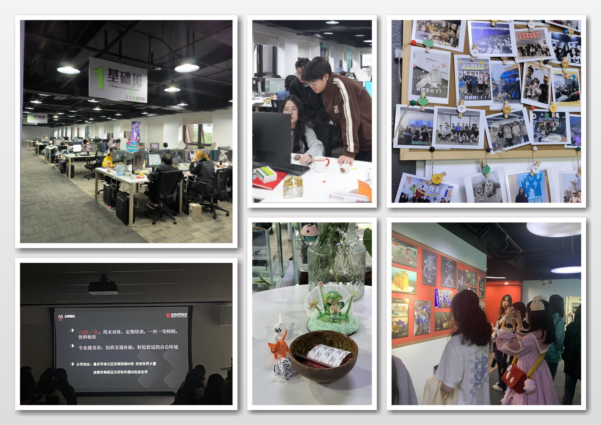 随后,由公司相关部门负责人带领同学们参观了公司的办公区、培训区,感受工作氛围。这期间,部门负责人还向同学们展示了公司的建模作品及游戏项目,同学们对此环节兴趣高涨。此外,同学们还参加了公司的员工休闲场所,例如健身房、茶水间等,也吸引了同学们的目光。