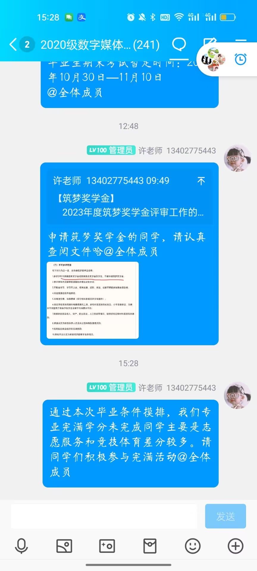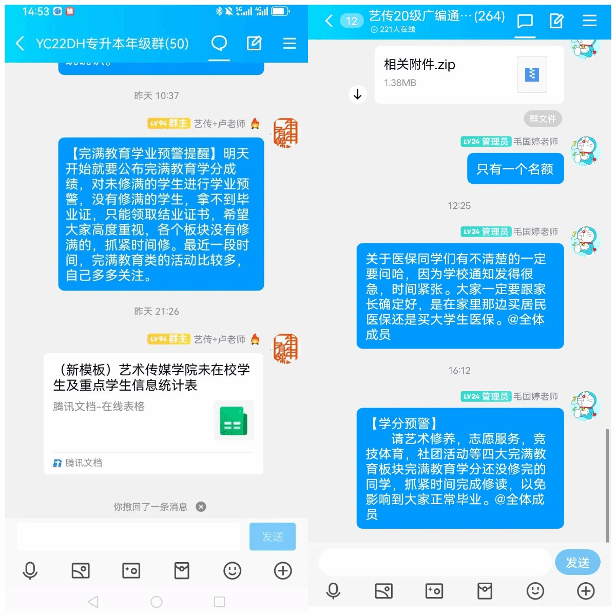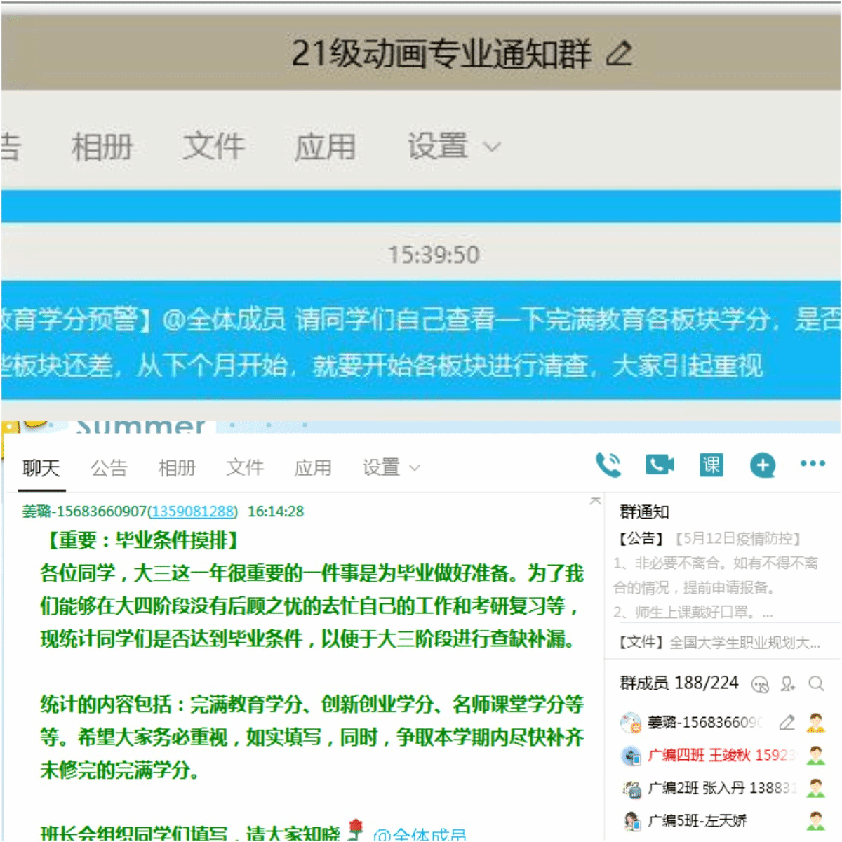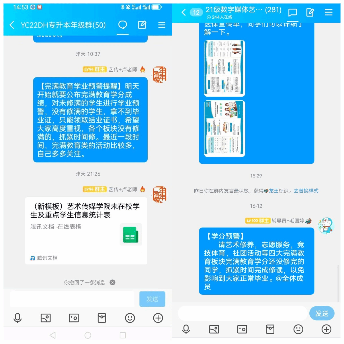 同时,老师除了每月定期公示学生完满学分修读情况之外,还对低分段同学进行学分预警。从“艺术修养,竞技体育,社团活动,志愿服务”四个板块出发,对于分值低,分值差距大的同学进行一对一交流方式,督促他们及时参加完满活动,以免对毕业造成影响,同时让他们认识到完满教育的重要性。希望大家抓住大学的宝贵时光,加强素质教育,全面发展德智体美劳,成就更好的自己。