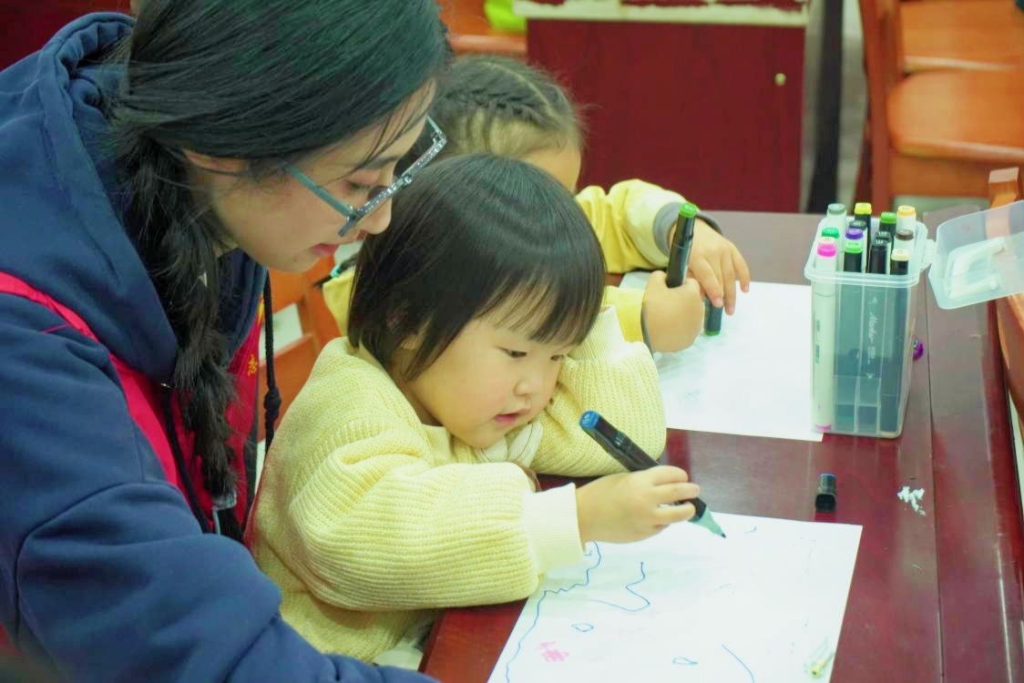 为让小朋友有更多的灵感来源,志愿者在活动开始前收集了许多绘画素材,并准备了画纸、马克笔、油画棒等相关绘画工具。绘画过程中,志愿者通过引导,拆分绘画步骤,用不同的绘画材料进行创作,教会小朋友绘画逻辑、基本构图方法以及着色技巧,鼓励小朋友充分发挥想象力和创造力。小朋友神奇的小手握着七彩的画笔,画出了满天的星河,画出了人间的浪漫,温暖又美好。