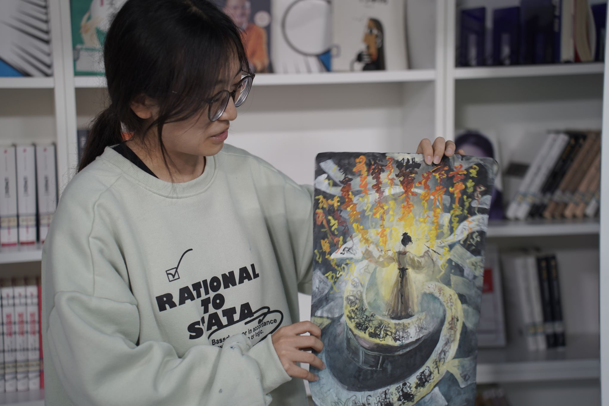 经过对绘画和书籍相结合的强烈讨论后,参与者依次对画作进行创作灵感及情感表达的分享,以及阐述了对此次大咖阅读的理解和自己的深层感悟。其中,蒋宇同学的画作以丰富的色彩相呈现,在光华流转间,执笔画丹青,落笔映墨痕。王丽超同学则是以具有线条设计感的作画方式,冲破艺术的隔阂,一挥而就。