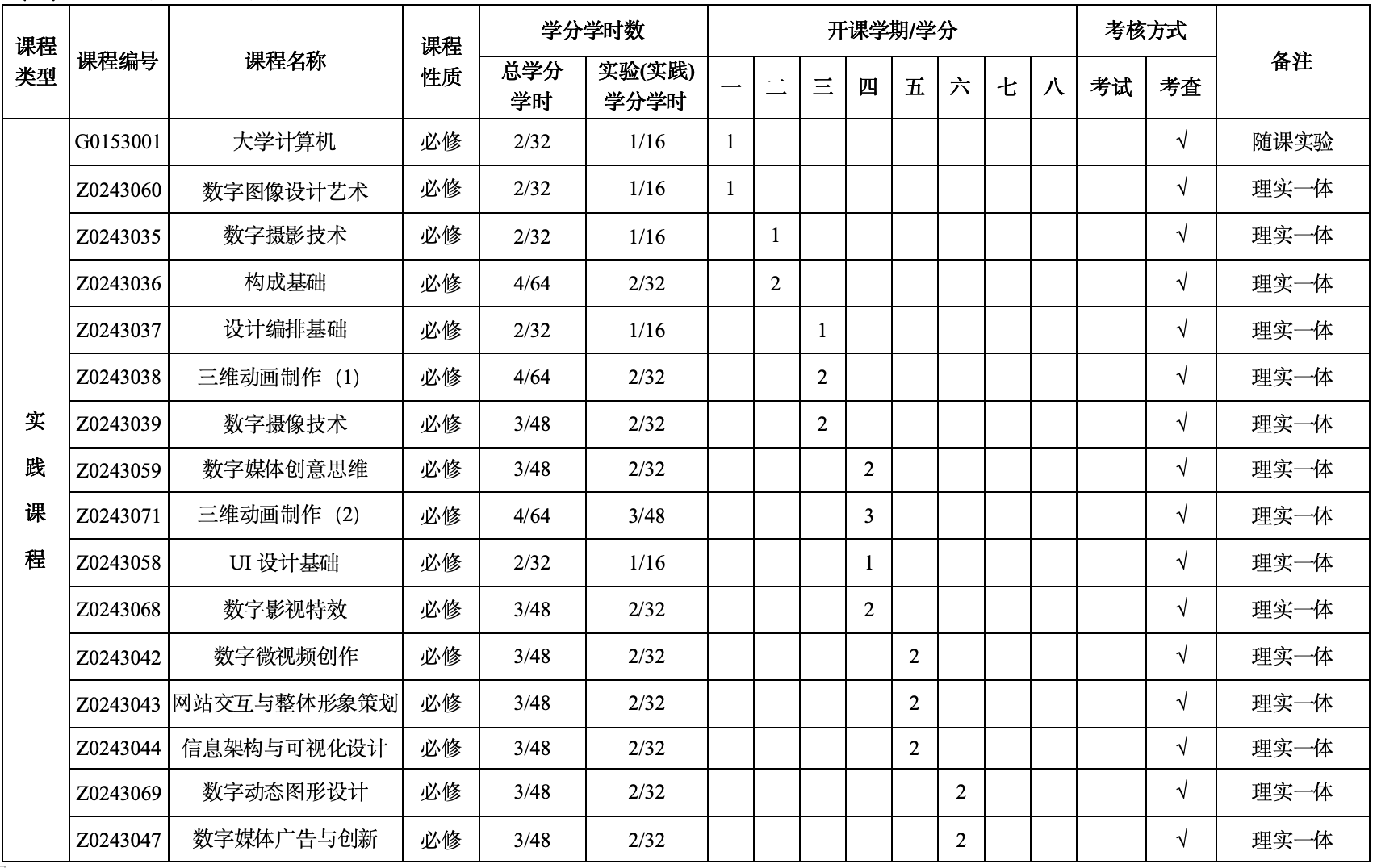 为破解“理论与实践脱节”难题,专业打造了以专业实验室为核心、多层次实践性教育环节为支撑的实践教学体系。三维与动画实验室配备高配置图形工作站与专业动画软件,支撑三维动画制作(1)(2)等课程实践,为三维动画制作、数字角色设计等课程提供专属实践空间;移动多媒体综合实验室搭载Adobe全套设计软件,服务UI设计基础、网站交互与整体形象策划等实训,满足UI设计、H5设计、MG动画设计等多领域实践需求;平面视觉实验室聚焦数字图像设计艺术、构成基础等基础实践;非线性编辑实验室以专业剪辑系统为核心,保障数字微视频创作、数字影视特效等课程教学。同时,实践环节贯穿人才培养全过程,涵盖军事课、劳动教育、实验课、课程设计、写生创作、认识实习、专业实习、毕业实习、毕业论文(设计)等,其中毕业实习8周、毕业论文(设计)14周,让学生在全流程实践中锤炼技能。
