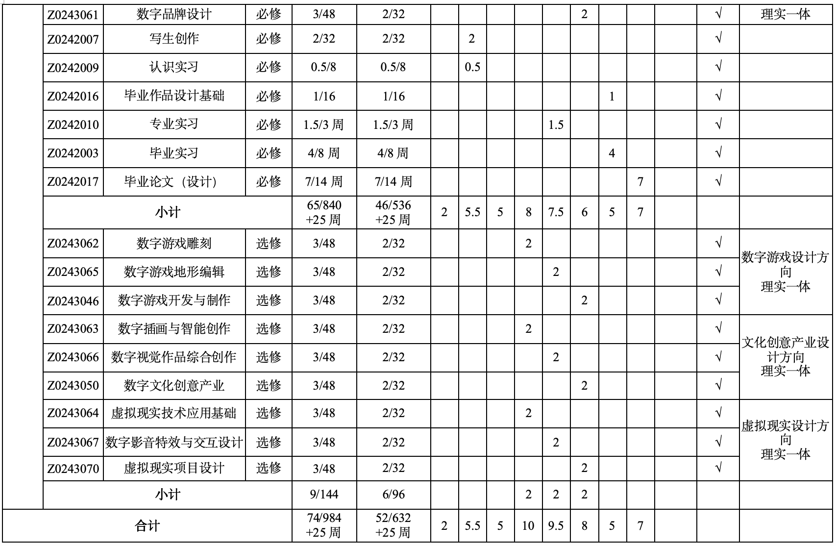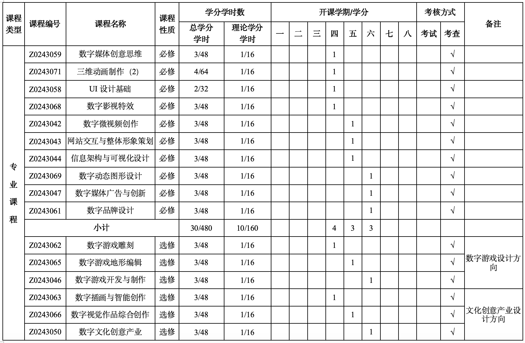 专业教育模块作为核心支撑,划分学科基础、专业基础、专业理论、专业实践四大课程群,主干课程涵盖数字图像设计艺术、三维动画制作、数字影视特效、网站交互与整体形象策划、信息架构与可视化设计、数字媒体广告与创新、数字品牌设计等核心内容,全面覆盖影视特效、交互设计、数字游戏、文化创意等关键领域。为满足学生个性化发展,专业开设三大特色方向选修课程:数字游戏设计方向的数字游戏雕刻、数字游戏开发与制作;文化创意产业设计方向的数字插画与智能创作、数字文化创意产业;虚拟现实设计方向的虚拟现实技术应用基础、虚拟现实项目设计,让学生精准对接行业细分需求。
