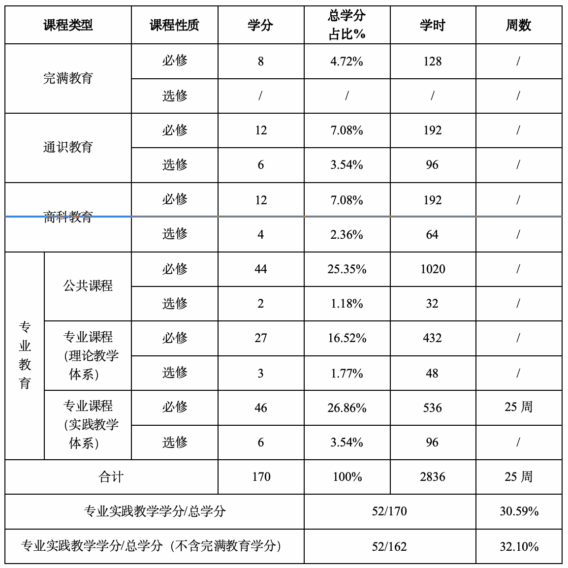 专业精心构建了“完满教育+通识教育+商科教育+专业教育”四位一体的课程体系,总学分170分,专业实践教学学分占比达30.59%,形成基础扎实、特色鲜明、衔接有序的课程矩阵。课程设置精准对接毕业要求,实现“知识传授、能力培养、价值塑造”的有机统一,全方位支撑“通专业、善管理、强创新”的培养目标落地。